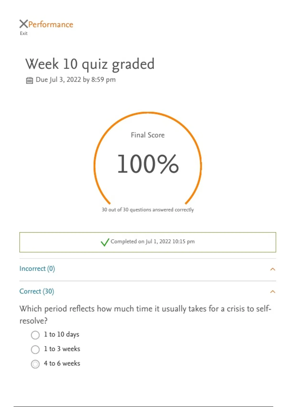 30 out of 30 questions answered correctly