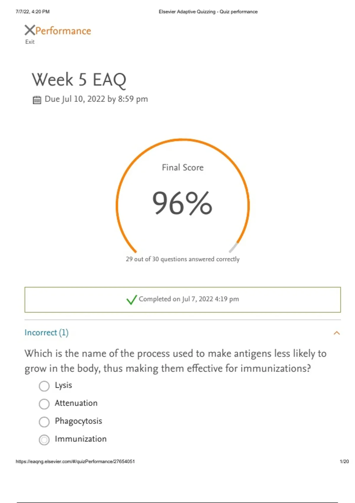 , 7/7/22, 4:20 PM Elsevier Adaptive Quizzing - Quiz performance