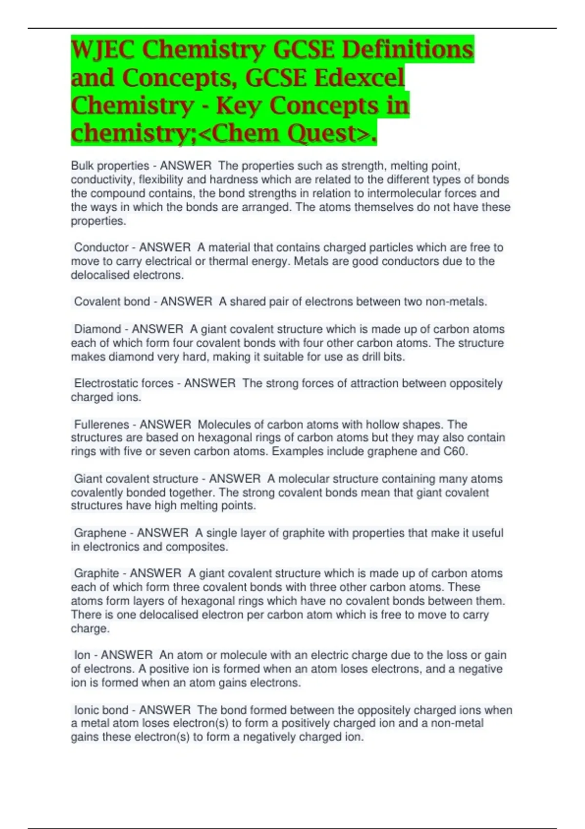 chemistry;&lt;Chem Quest&gt;. Bulk properties - ANSWER The properties such as strength, melting point, conductivity, flexibility and hardness which are related to the different types of bonds the compound contains, the bond strengths in relation to intermolecular forces and the ways in which the bonds are arranged. The atoms themselves do not have these properties. Conductor - ANSWER A material that contains charged particles which are free to move to carry electrical or thermal energy. Metals are good conductors due to the delocalised electrons. Covalent bond - ANSWER A shared pair of electrons between two non-metals. Diamond - ANSWER A giant covalent structure which is made up of carbon atoms each of which form four covalent bonds with four other carbon atoms. The structure makes diamond very hard, making it suitable for use as drill bits. Electrostatic forces - ANSWER The strong forces of attraction between oppositely charged ions. Fullerenes - ANSWER Molecules of carbon atoms with hollow shapes. The structures are based on hexagonal rings of carbon atoms but they may also contain rings with five or seven carbon atoms. Examples include graphene and C60. Giant covalent structure - ANSWER A molecular structure containing many atoms covalently bonded together. The strong covalent bonds mean that giant covalent structures have high melting points. Graphene - ANSWER A single layer of graphite with properties that make it useful in electronics and composites