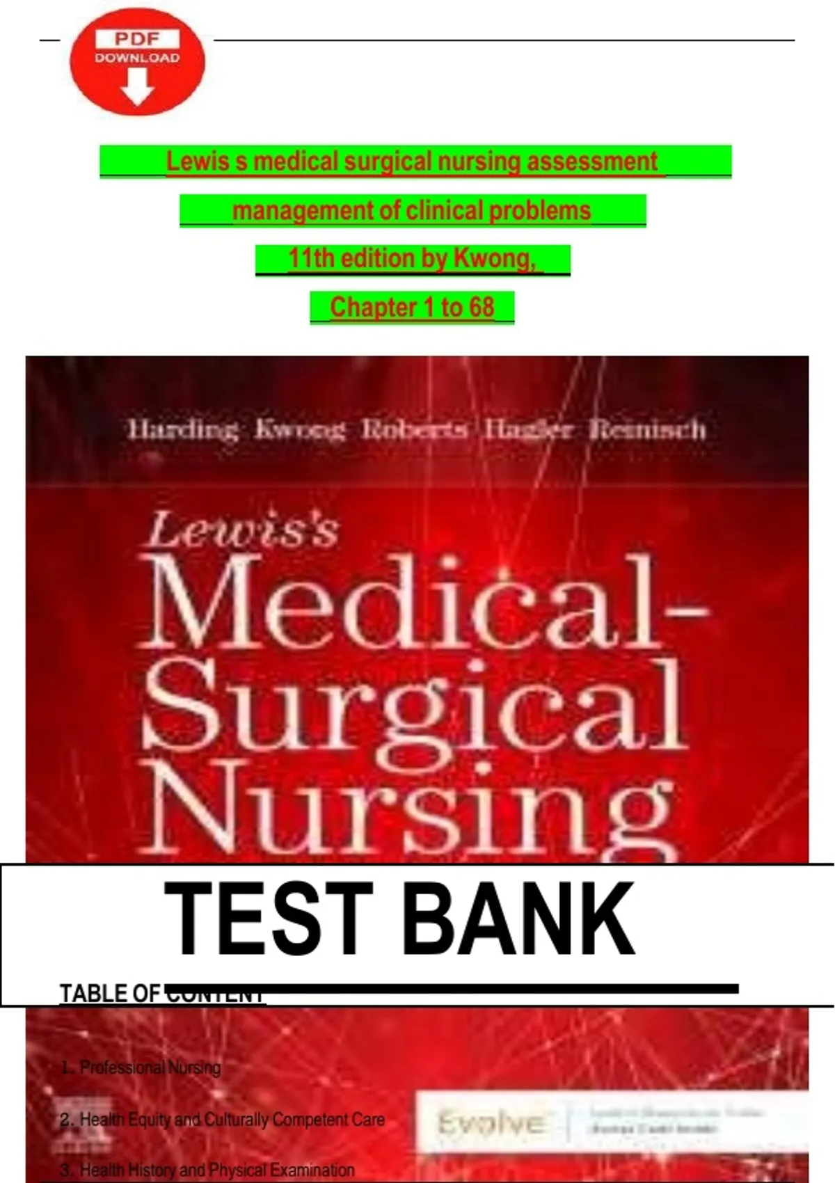 INSTANT PDF DOWNLOAD – This Lewis’s Medical-Surgical Nursing: Assessment and Management of Clinical Problems, 11th Edition by Kwong and colleagues is a comprehensive test bank and study guide covering all 68 chapters of one of the most trusted resources in nursing education. It includes hundreds of NCLEX-style multiple-choice and alternate-format questions, each with correct answers, rationales, and reference page numbers directly aligned with the textbook. The content provides a detailed review of pathophysiology, assessment, diagnosis, and nursing management of a wide range of adult health problems. Topics include fluid and electrolyte balance, perioperative care, cardiovascular, respiratory, renal, neurological, endocrine, musculoskeletal, hematologic, gastrointestinal, and integumentary systems, as well as emergency, critical care, and end-of-life nursing. Each section emphasizes clinical judgment, safety, patient-centered care, and evidence-based practice, making it an invaluable resource for mastering complex medical-surgical concepts. Ideal for BSN, ADN, and NCLEX-RN candidates, this 2024-aligned guide supports course exams, clinical preparation, and national licensure testing. With its organized question structure and clear explanations, it helps students build confidence in managing real-world patient scenarios and developing advanced critical thinking skills.