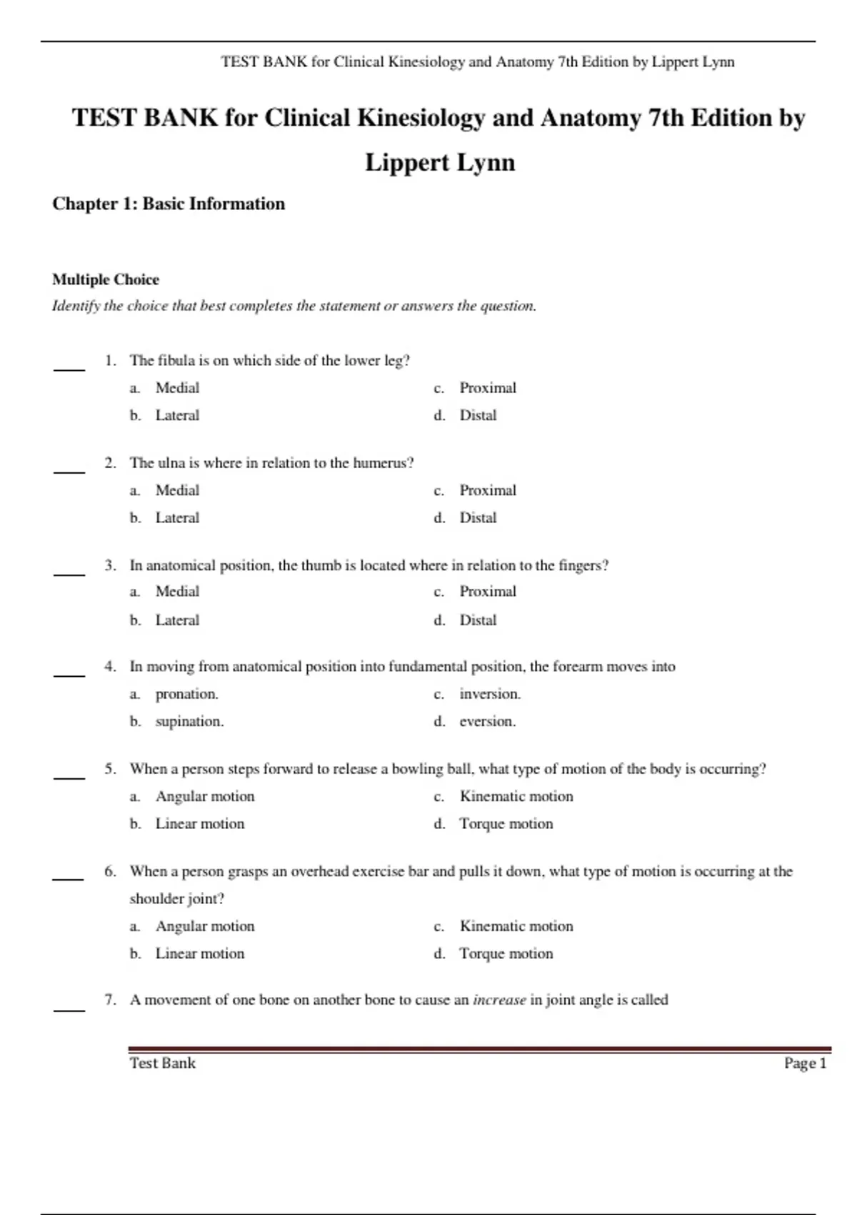 TEST BANK for Clinical Kinesiology and Anatomy 7th Edition by Lippert Lynn