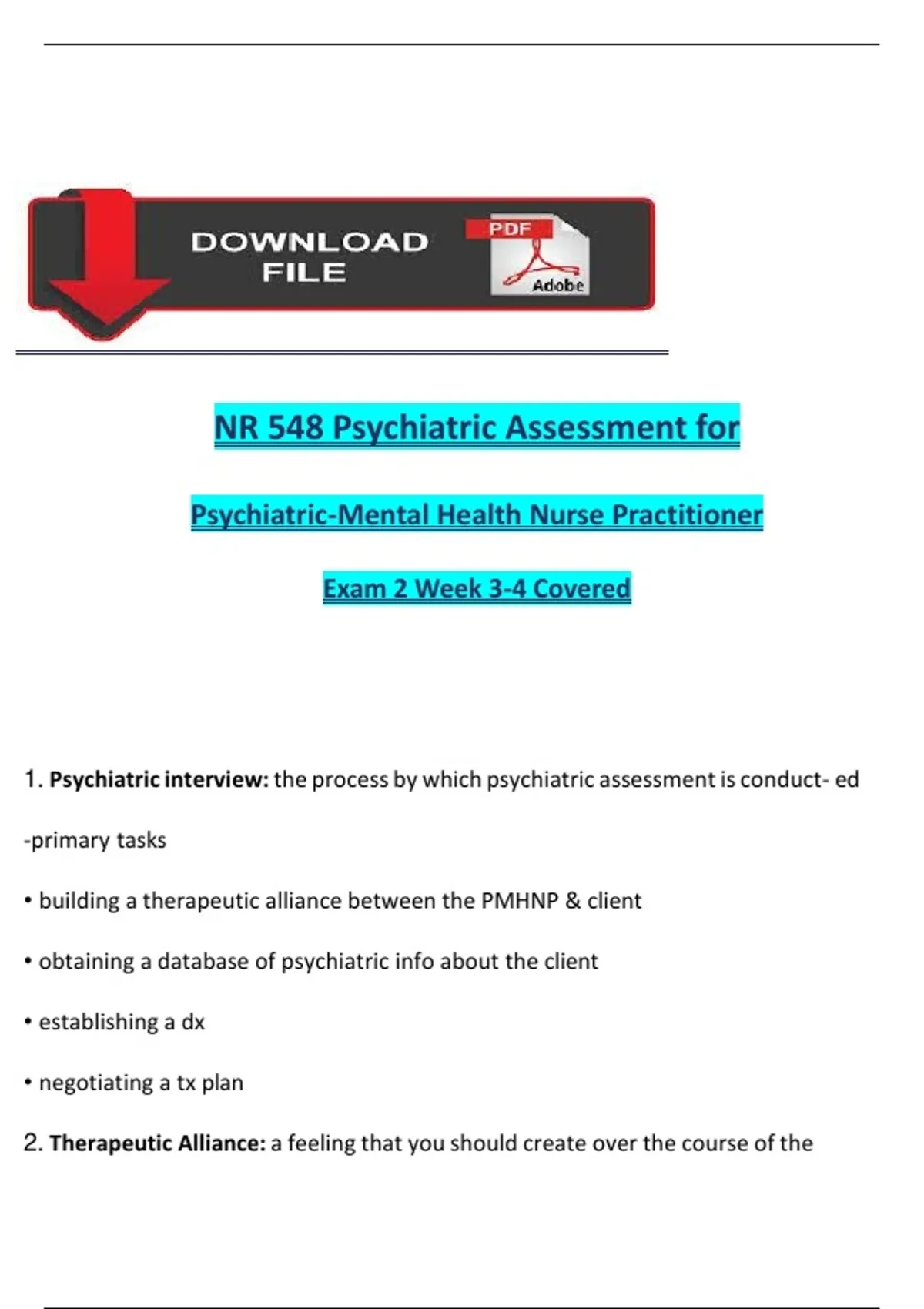 INSTANT PDF DOWNLOAD – This NR 548 Psychiatric Assessment for PMHNP Exam 2 (Weeks 3–4) Test Bank and Study Guide provides a detailed and verified set of exam questions, correct answers, and rationales specifically aligned with Week 3–4 course content. It is designed to help PMHNP students strengthen diagnostic reasoning, clinical assessment, and psychiatric evaluation skills in preparation for program exams and national certification. Content areas include advanced mental status examination, psychiatric interviewing techniques, differential diagnosis formulation, DSM-5-TR diagnostic criteria, psychopharmacologic considerations, neurobiological foundations of mental illness, and patient-centered therapeutic communication. Each question is written in clinical case and NGN-style format, mirroring the real testing environment for the PMHNP program. Ideal for Chamberlain NR 548 students, PMHNP programs, and psychiatric nursing exam prep, this verified resource supports mastery of advanced assessment skills, diagnostic accuracy, and clinical judgment essential for psychiatric mental health nurse practitioners.