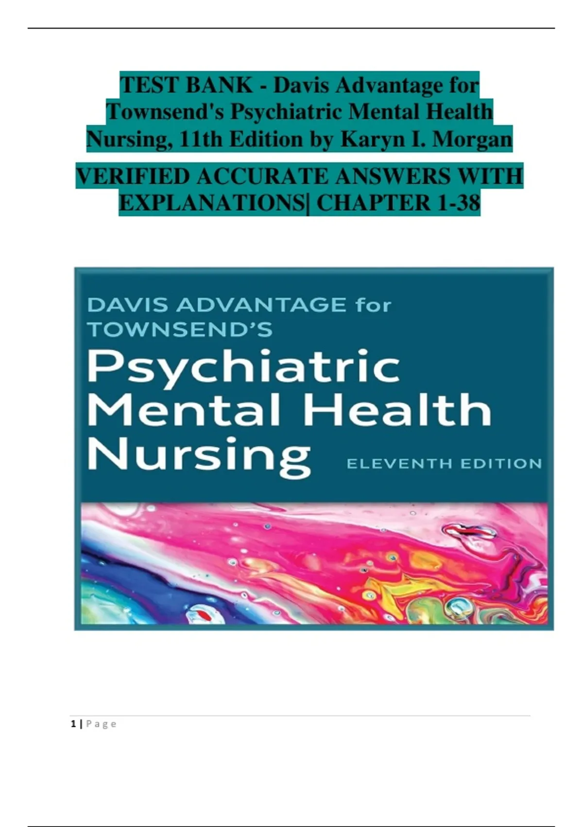 This comprehensive test bank accompanies Davis Advantage for Townsend’s Psychiatric Mental Health Nursing, 11th Edition by Karyn I. Morgan. It includes verified multiple-choice and multiple-response questions with detailed answer explanations covering all 38 chapters. Topics include stress adaptation, psychopharmacology, mental health and illness concepts, ethical and legal issues, communication, family interventions, and psychiatric disorders such as schizophrenia, bipolar disorder, anxiety, and depression. Ideal for nursing students preparing for exams and NCLEX-style assessments, this complete set supports in-depth understanding of psychiatric nursing concepts and evidence-based practice.