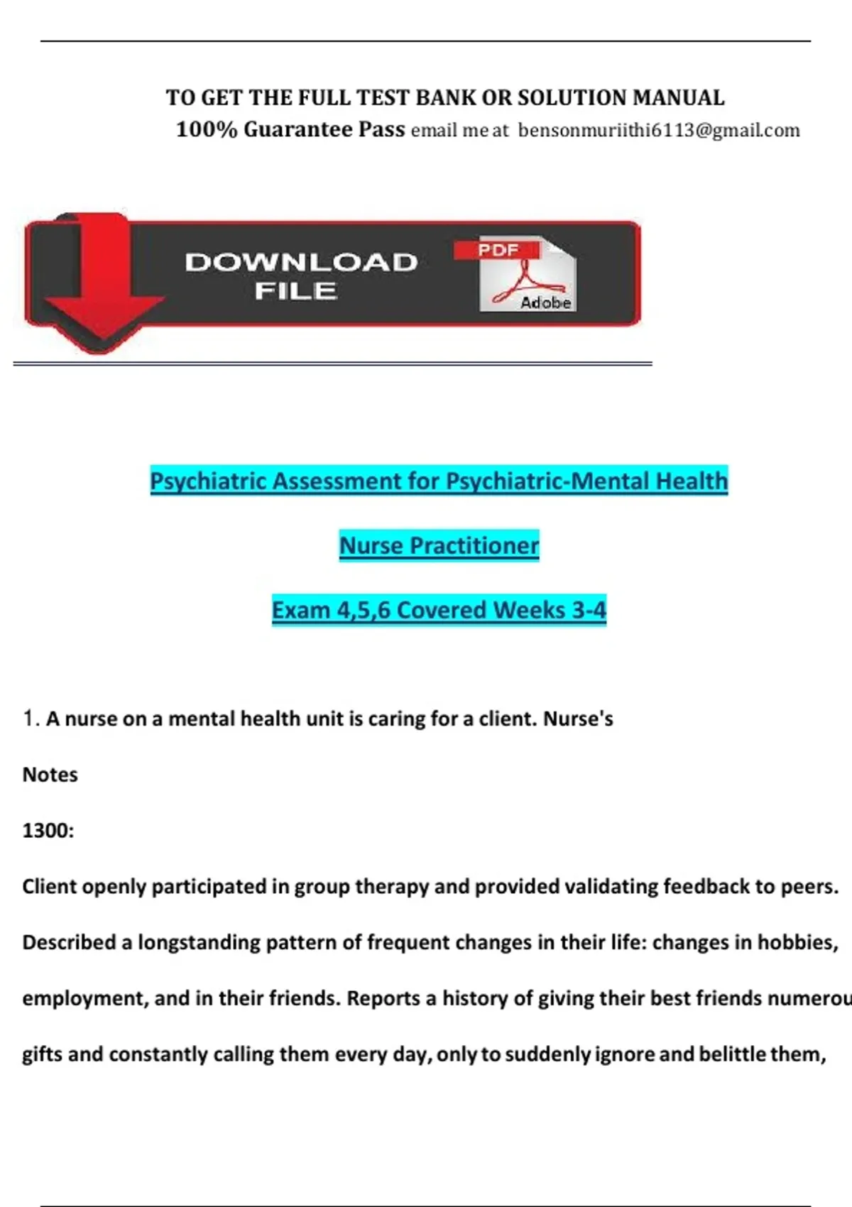 INSTANT PDF DOWNLOAD – This Psychiatric Assessment for Psychiatric-Mental Health Nurse Practitioner (PMHNP) Exams 4, 5, & 6 Test Bank and Study Guide comprehensively covers Weeks 3–4 course material with verified exam questions, correct answers, and detailed rationales. Tailored for PMHNP students, this updated resource strengthens diagnostic reasoning, assessment accuracy, and critical thinking skills in advanced psychiatric practice. Topics include comprehensive mental health assessment, diagnostic formulation using DSM-5-TR criteria, neurobiological underpinnings of psychiatric disorders, psychopharmacologic and psychosocial interventions, risk assessment, and therapeutic communication. Each question mirrors Next Generation NCLEX (NGN) and PMHNP-level exam formats, emphasizing clinical judgment, prioritization, and patient-centered care in psychiatric settings. Ideal for graduate nursing students, PMHNP candidates, and educators, this verified guide supports preparation for program exams and certification tests by offering high-quality, evidence-based review materials aligned with current psychiatric nursing practice standards.