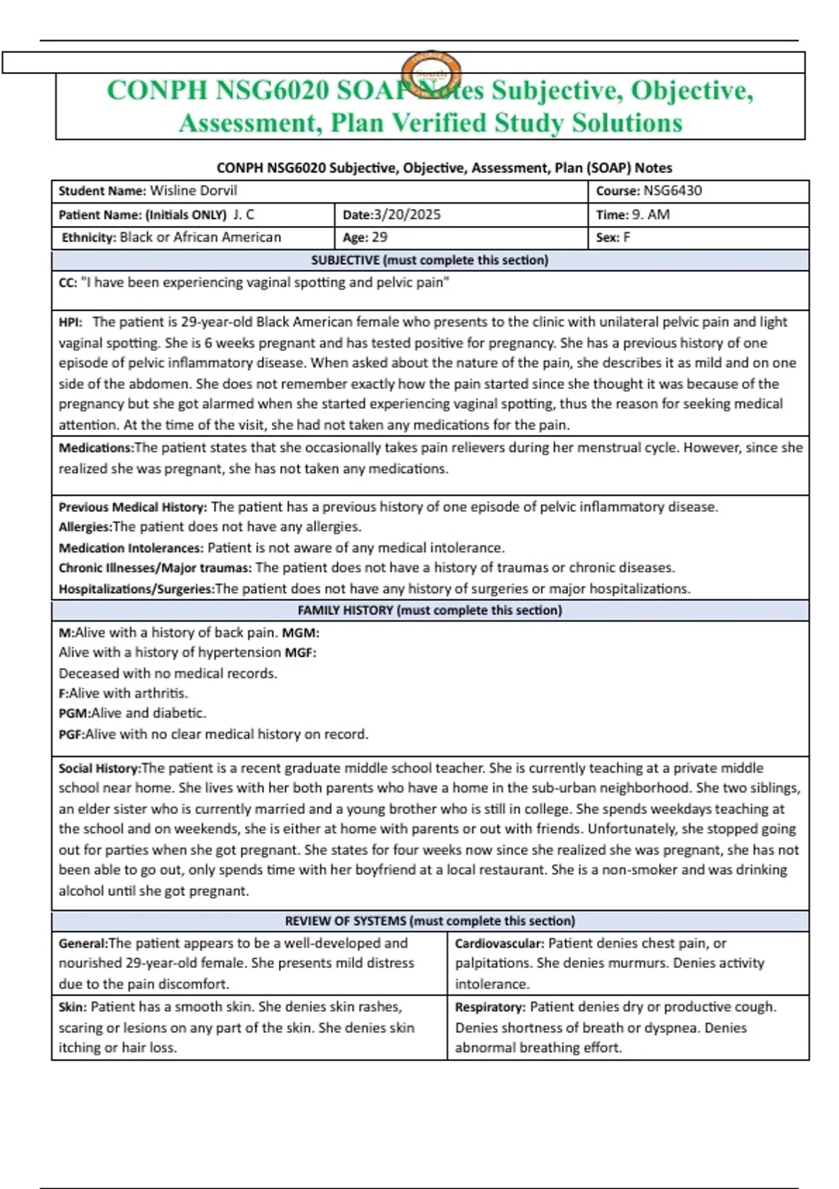 CONPH NSG6020 Subjective, Objective, Assessment, Plan (SOAP) Notes