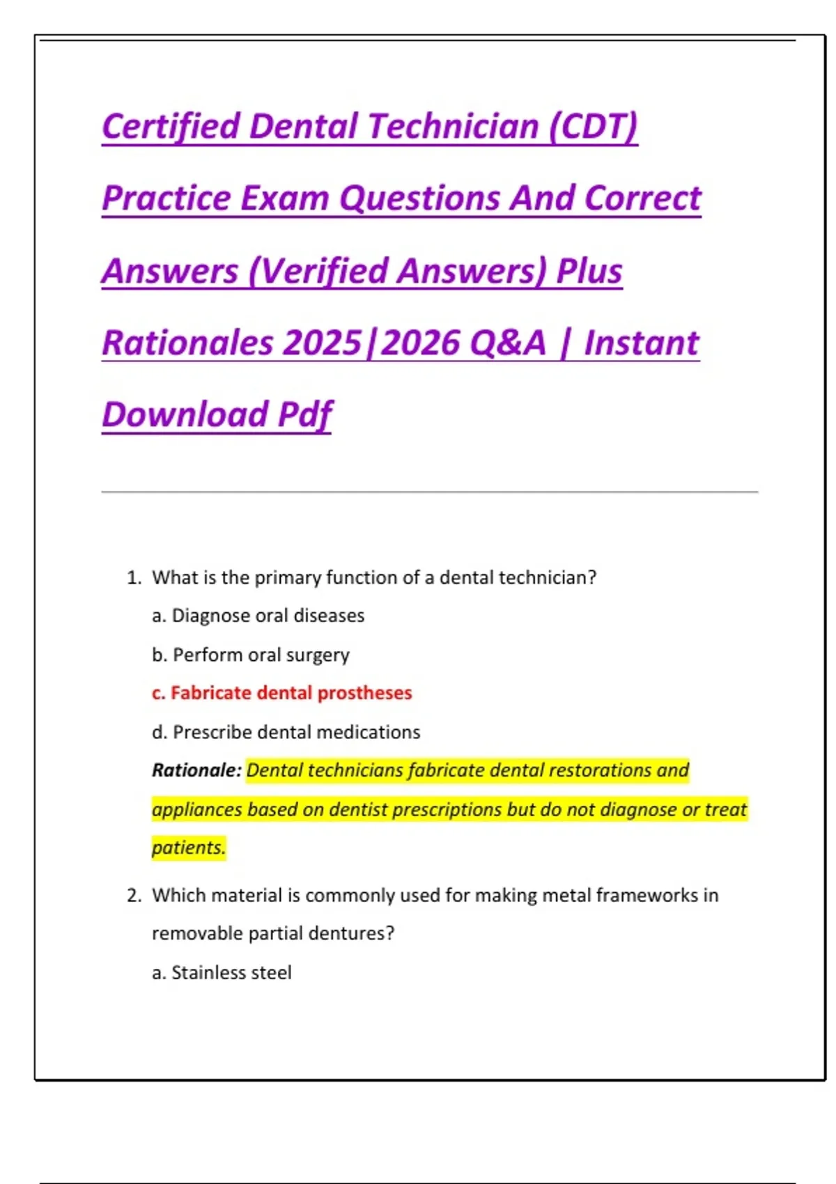Certified Dental Technician (CDT) Practice Exam Questions And Correct Answers (Verified Answers) Plus Rationales 2025|2026 Q&A | Instant Download Pdf