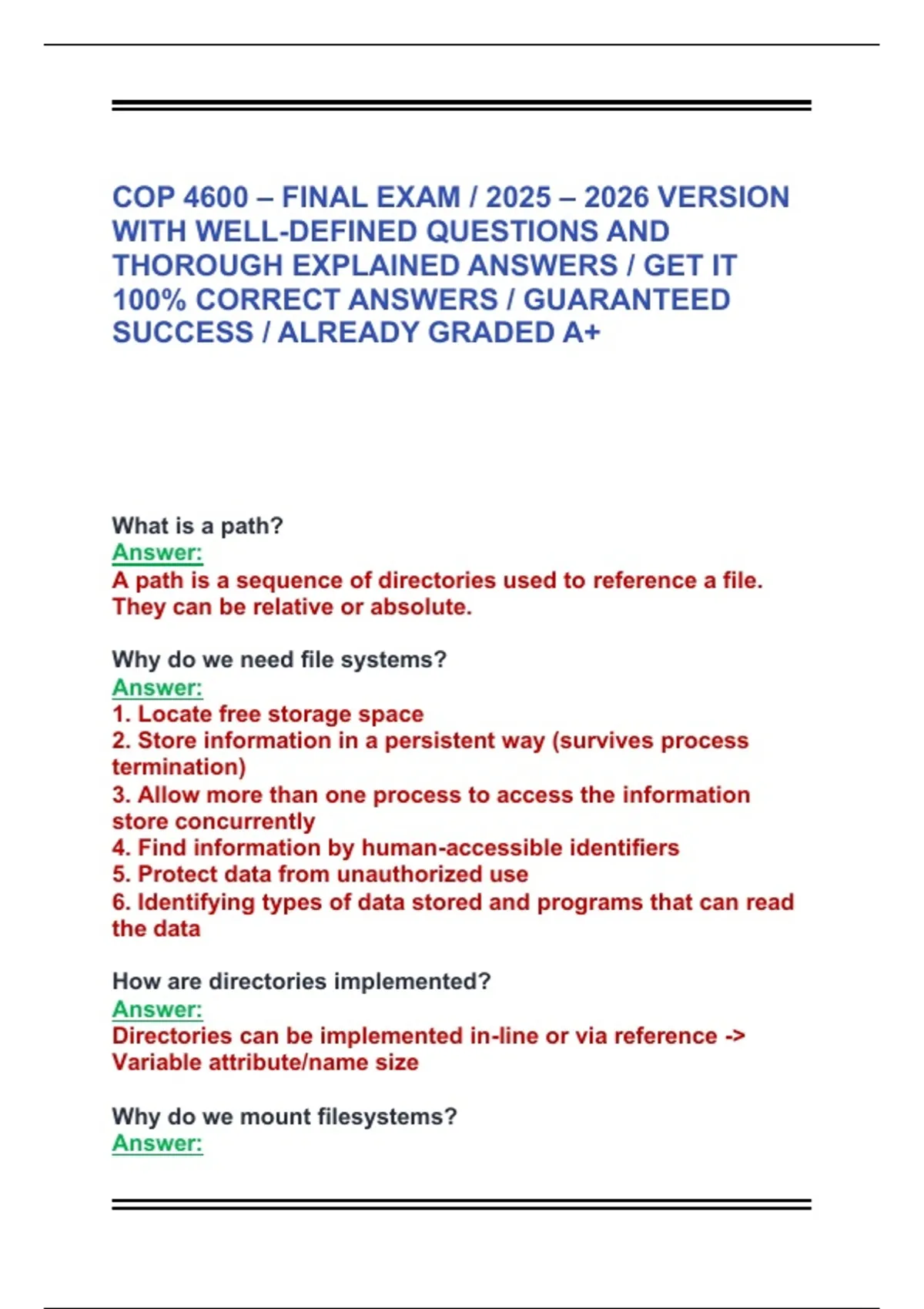 COP 4600 – FINAL EXAM / 2025 – 2026 VERSION WITH WELL-DEFINED QUESTIONS AND THOROUGH EXPLAINED ANSWERS / GET IT 100% CORRECT ANSWERS / GUARANTEED SUCCESS / ALREADY GRADED A+