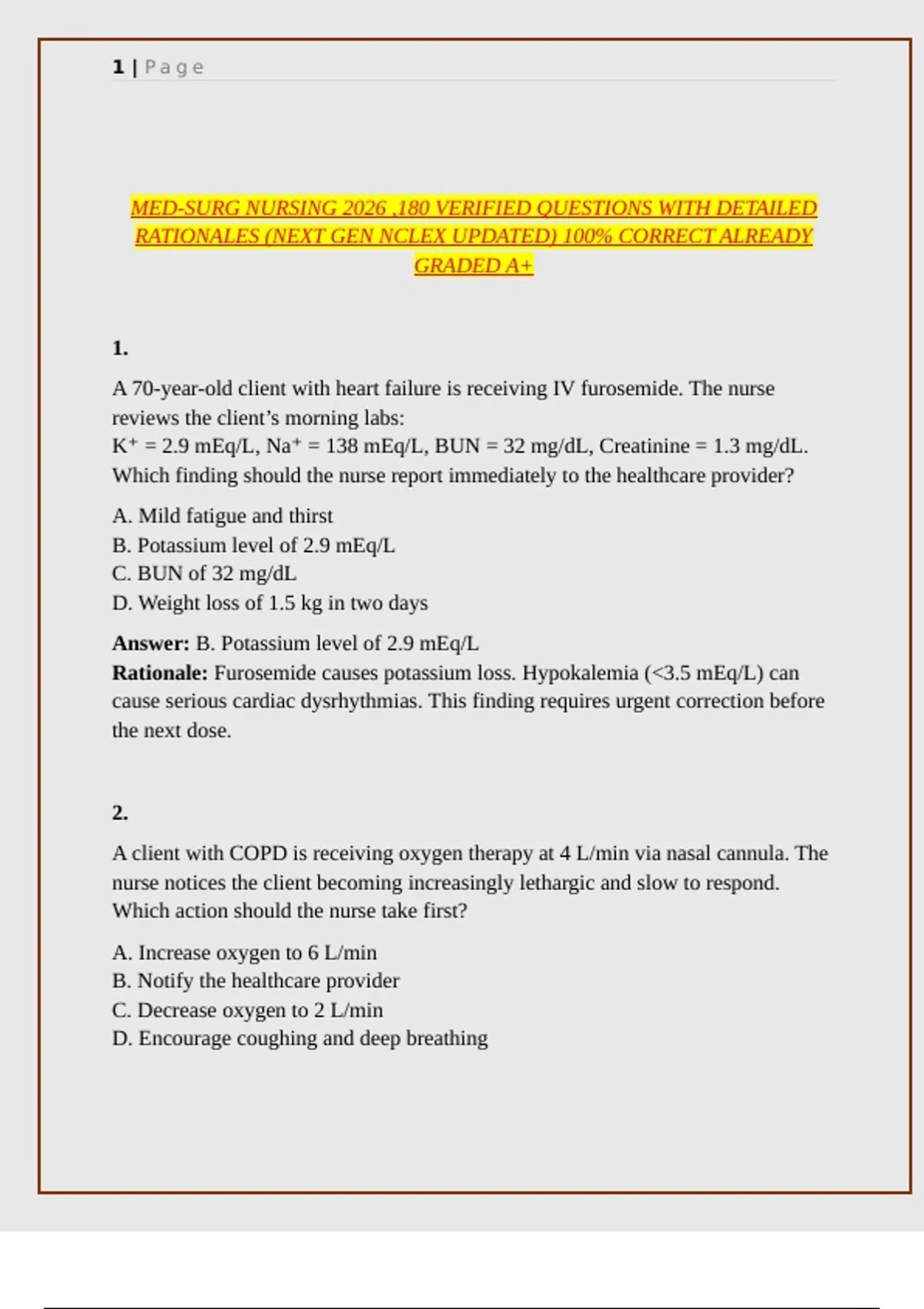MED-SURG NURSING 2026 ,180 VERIFIED QUESTIONS WITH DETAILED