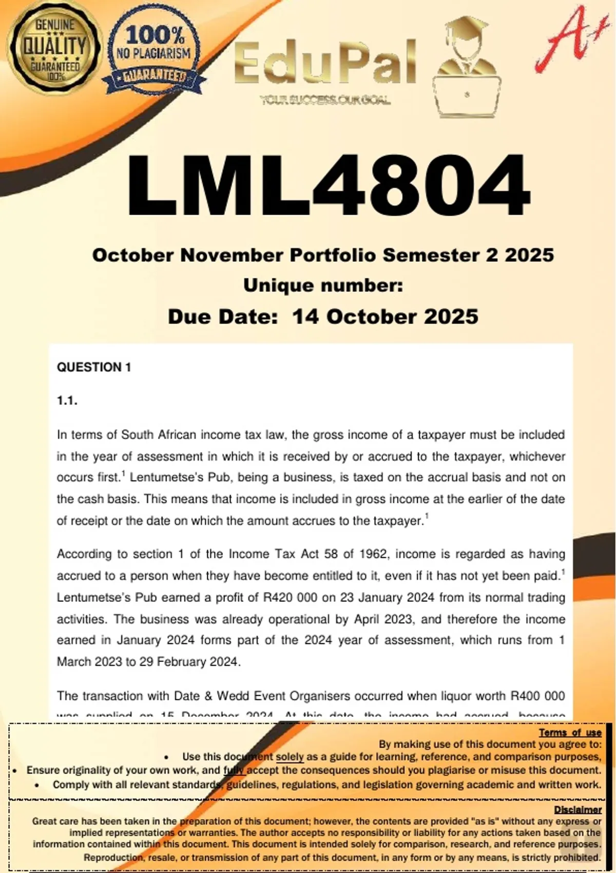 LML4804 PORTFILIO (COMPLETE ANSWERS) Semester 2 2025 - DUE 14 October 2025; 100% TRUSTED Complete, trusted solutions and explanations. For assistance, Whats-App 0.6.7-1.7.1-1.7.3.9. Ensure your success with us.. VQUESTION 1 (GROSS INCOME) After retiring from playing professional hockey, Lentumetse applied for a liquor licence on 04 April 2023 in order to start a liquor business in Bopcity (Pretoria, Gauteng). Although Lentumetse only received her licence on 08 July 2023, she had already commenced trading in April 2023 under the name Lentumetse’s Pub. On 23 January 2024, Lentumetse’s Pub earned a profit of R420 000. Noticing the success of the business, her friend Kgopotso advised her to join Events Support Club (“ESC”). When a person becomes a member of the ESC, their name is added to the list of distributors which supply organisations, companies or individuals hosting events or functions with liquor on credit. The distributor will then receive payment within three months after the hosting of such event or function by such organisation, company or individual. On 15 December 2024, Lentumetse’s Pub (as a member of the ESC), supplied liquor worth R400 000 to Date & Wedd Event Organisers (Date & Wedd). After Date & Wedd had hosted a successful high-profile celebrity marriage during December 2024, it paid only R250 000 to Lentumetse’s Pub on 28 February 2025 from the total invoice of R400 000. However, Date & Wedd refused to pay the balance owing to a dispute related to the quantum of liquor that was supplied by Lentumetse’s Pub. On 29 April 2025, the outstanding balance of R150 000 was paid after the dispute was resolved as it was proven that Lentumetse’s Pub had indeed supplied the correct amount of liquor to Date & Wedd. Lentumetse’s frustrations began when the business was not able to generate quick profit as a result of selling liquor on credit. In order to increase her business profit margins, she came up with an idea to invite a top local DJ to perform at her pub on the last Saturday of every month. She charges each person an entrance fee of R50. During July 2025, Lentumetse’s Pub made a whopping profit of R1,5 million. However, the community raised complaints against Lentumetse’s Pub. Two of the complaints were that Lentumetse’s Pub sells alcohol to children under the age of 18 and also that the pub operated until 05:00 in the morning. The Liquor Board and South African Police Service (“SAPS”) investigated the complaints, and the investigations revealed that Lentumetse’s Pub sold alcohol to children under the age of 18 years and that Lentumetse’s Pub operated outside regulated hours. Further to the investigations, the police also discovered that Lentumetse’s Pub sold prohibited and illegal substances such as dagga and drugs. Lentumetse’s Pub liquor licence was terminated, and Lentumetse, as the owner, was subsequently arrested. WHAT IS REQUIRED OF YOU: 1.1 Discuss in which tax year/s the income received by Lentumetse’s Pub in January 2024, February 2025 and April 2025 will fall into and motivate your answer with reference to relevant applicable legal principles. [10] 1.2 Advise Lentumetse’s Pub on whether it will be liable for income tax on the income received from charging entrance fee. Also, advise whether it will be liable for income LML4804 OCT/NOV EXAM 2025 tax on the profit received from the sale of prohibited and illegal substances such as drugs and dagga. [5] SUB-TOTAL FOR QUESTION 2 [15 marks] QUESTION 2 (DEDUCTIONS) Iketleng Spa (Pty) Ltd (“Iketle”) is a well-known and respected spa that has been in this business for fifteen years. One of the reasons why Iketle has been successful in this industry is that Ms Moon, the CEO of Iketle, has introduced the following programmes; • Iketle pays for Miss Sun to attend a workshop held annually by the Department of Health in which the attendees are taught about wellness treatments, gaining expertise in basic salon services. The workshop costs R8 000 annually; • Miss Sun, a consultant, also attends the ethical leadership seminar held by Padi Business Leadership Consultant (Pty) Ltd (“PBLC”). The seminar costs R3 000 annually; • Miss Star and Miss Galaxy are somatologists and, as such, Mr Moon, on behalf of Iketle, has taken an insurance policy for injuries, death or illness which might occur to them in the performance of their duties. The company pays a total premium of R12 000 per annum respectively; and • Each year, mostly towards the end of the year, all the employees of the company go on a vacation sponsored by the company for team building purposes and the company spends R50 000 annually for such activities. WHAT IS REQUIRED OF YOU? 2.1 With reference to the Income Tax Act 58 of 1962 and case law, advise Iketleng Spa (Pty) Ltd on the deductibility of all the expenses. [15] QUESTION 3 (CGT) Mrs Gomolemo Molate (Momo), is a South African resident residing in Bela-Bela, Limpopo Province. She worked for one of the top auditing firms in the country, PMP Auditors, as a chartered accountant for 10 years. On 15 May 2023, she was invited to an interview at the South African Renewable Energy Agency, a State-Owned Enterprise, for the position of Chief Executive Officer (CEO). After going through a gruelling interview with other potential candidates, she received an appointment letter from the chairperson of the board informing her that she was the successful candidate. Her responsibilities would include, amongst others, implementing government’s plan to transition to renewable energy. LML4804 OCT/NOV EXAM 2025 After a long discussion with her husband, in June 2023 Momo decided to resign from PMP Auditors to take her new role as a CEO. 3.1. Discuss how the residency of a taxpayer influences their capital gains tax consequences. [5 marks] 3.2. Discuss the capital gains tax consequences should Momo receive R3 million worth of shares and R5 million as severance package from PMP Auditors. [