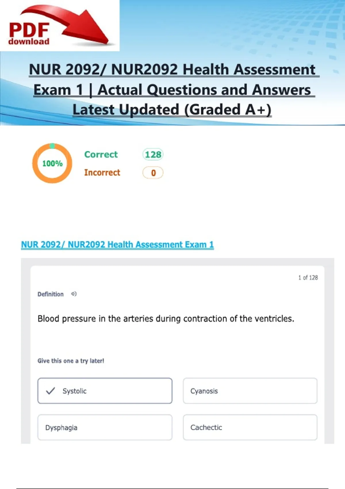 NUR 2092/ NUR2092 Health Assessment Exam 1 | 128 Actual Questions and Answers Latest Updated 2025/2026 (Graded A+)