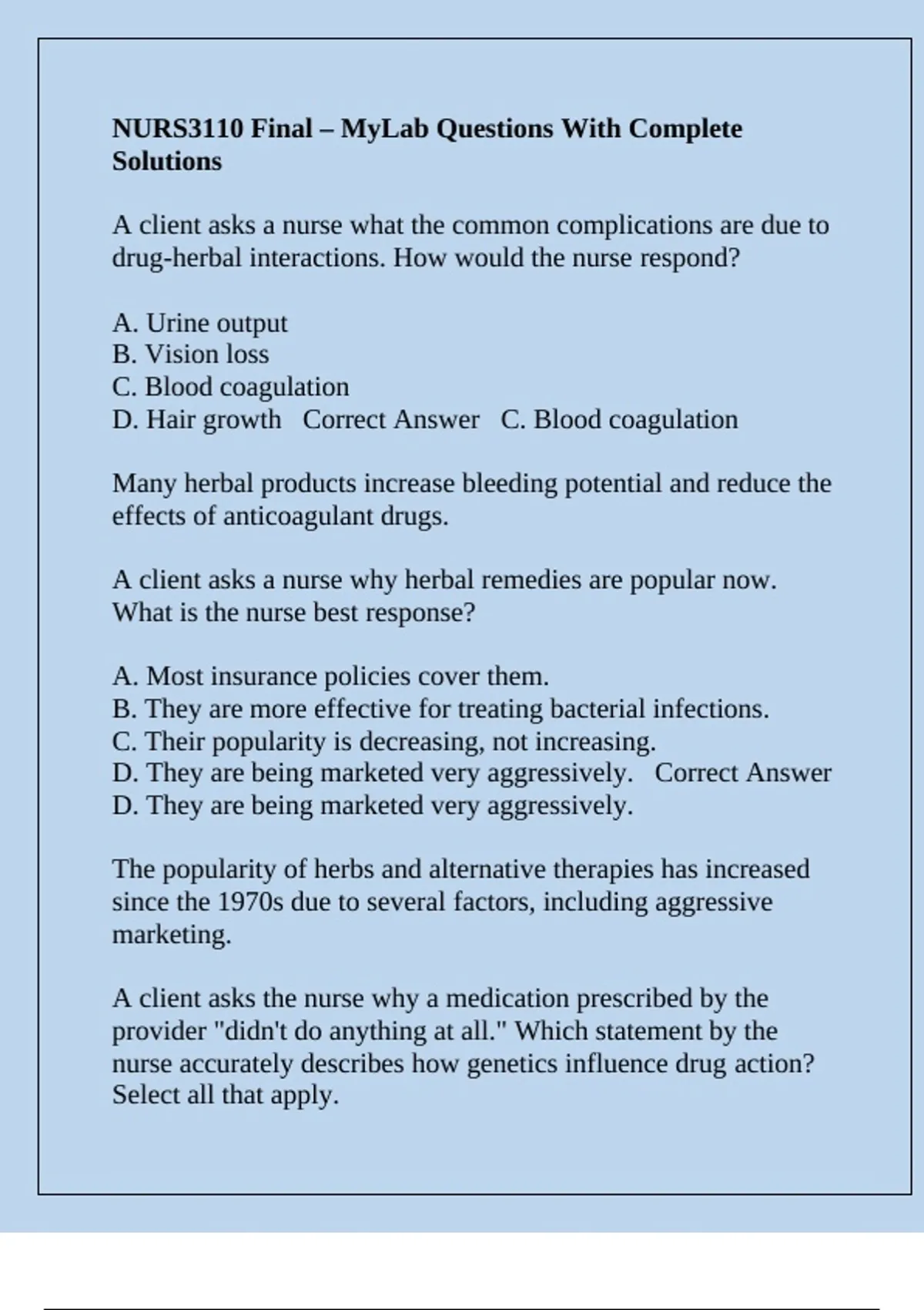 NURS3110 Final – MyLab Questions With Complete Solutions