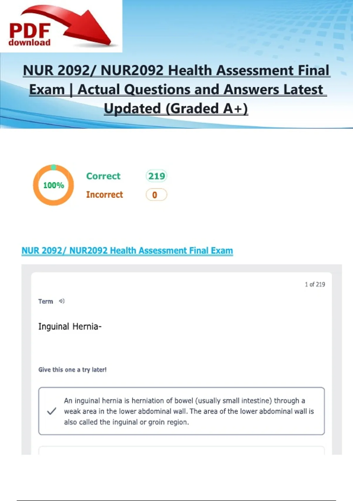 NUR 2092/ NUR2092 Health Assessment Final Exam | 219 Actual Questions and Answers Latest Updated 2025/2026 (Graded A+)