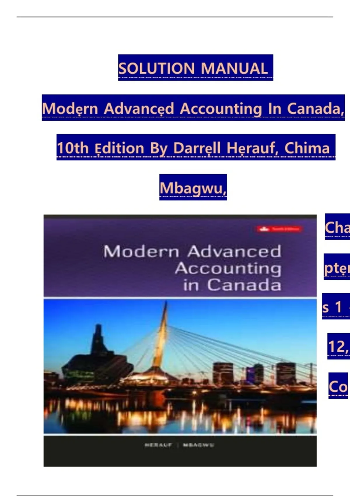 Access the complete and verified Solution Manual for Modern Advanced Accounting in Canada (9th Edition) by Hilton and Murray — available in PDF format. This comprehensive guide provides step-by-step solutions, accurate calculations, and chapter-by-chapter explanations for all textbook problems, helping students grasp advanced accounting concepts with ease. Covers consolidations, partnerships, foreign currency translation, financial instruments, and not-for-profit accounting Includes fully solved exercises and numerical examples Perfect for university accounting courses, CPA preparation, and instructors Updated to match the latest Canadian accounting standards (IFRS & ASPE) An essential resource for mastering advanced financial reporting and consolidation principles in Canadian accounting contexts.