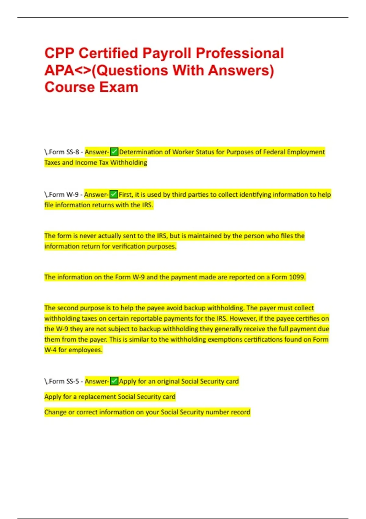 CPP Certified Payroll Professional APA<>(Questions With Answers) Course Exam