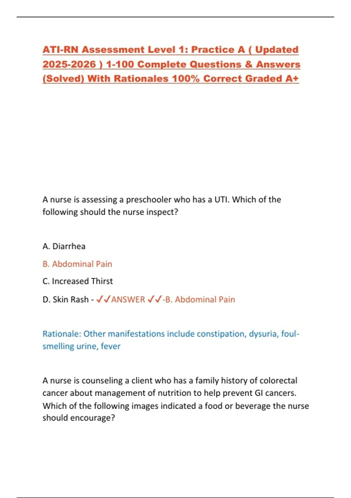 ATI-RN Assessment Level 1: Practice A ( Updated ) 1-100 Complete Questions & Answers (Solved) With Rationales 100% Correct Graded A+