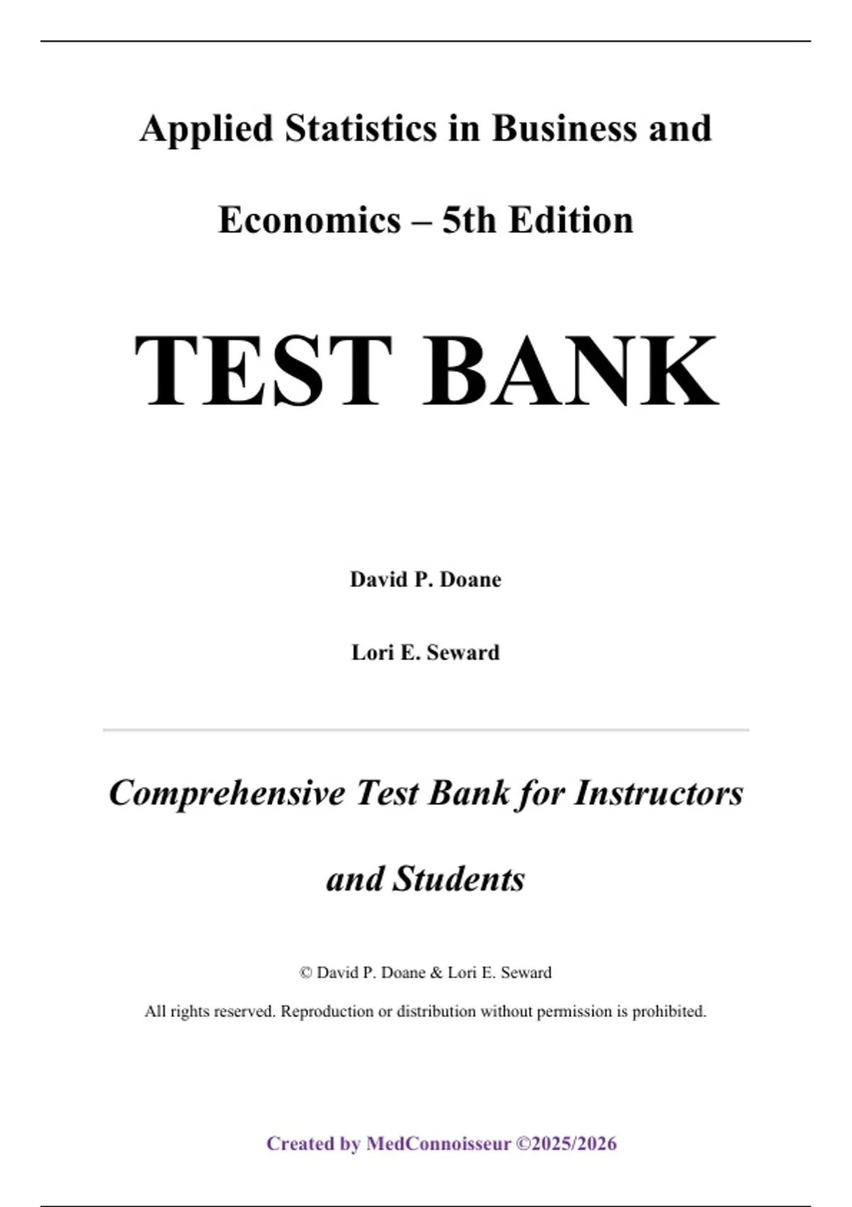 The Test Bank for Applied Statistics in Business and Economics, 5th Edition by David Doane and Lori Seward offers a fully verified suite of assessment items mapped to the official McGraw-Hill edition. This resource includes multiple-choice, true/false, short-answer, and applied problem questions aligned with each chapter’s learning goals and statistical methodology. All chapters include:...Chapter 1: Overview of Statistics, Chapter 2: Data Collection, Chapter 3: Describing Data Visually, Chapter 4: Descriptive Statistics, Chapter 5: Probability, Chapter 6: Discrete Probability Distributions, Chapter 7: Continuous Probability Distributions, Chapter 8: Sampling Distributions and Estimation, Chapter 9: One-Sample Hypothesis Tests, Chapter 10: Two-Sample Hypothesis Tests, Chapter 11: Analysis of Variance, Chapter 12: Simple Regression, Chapter 13: Multiple Regression, Chapter 14: Time-Series Analysis, Chapter 15: Chi-Square Tests, Chapter 16: Nonparametric Tests, Chapter 17: Quality Management, Chapter 18: Simulation
