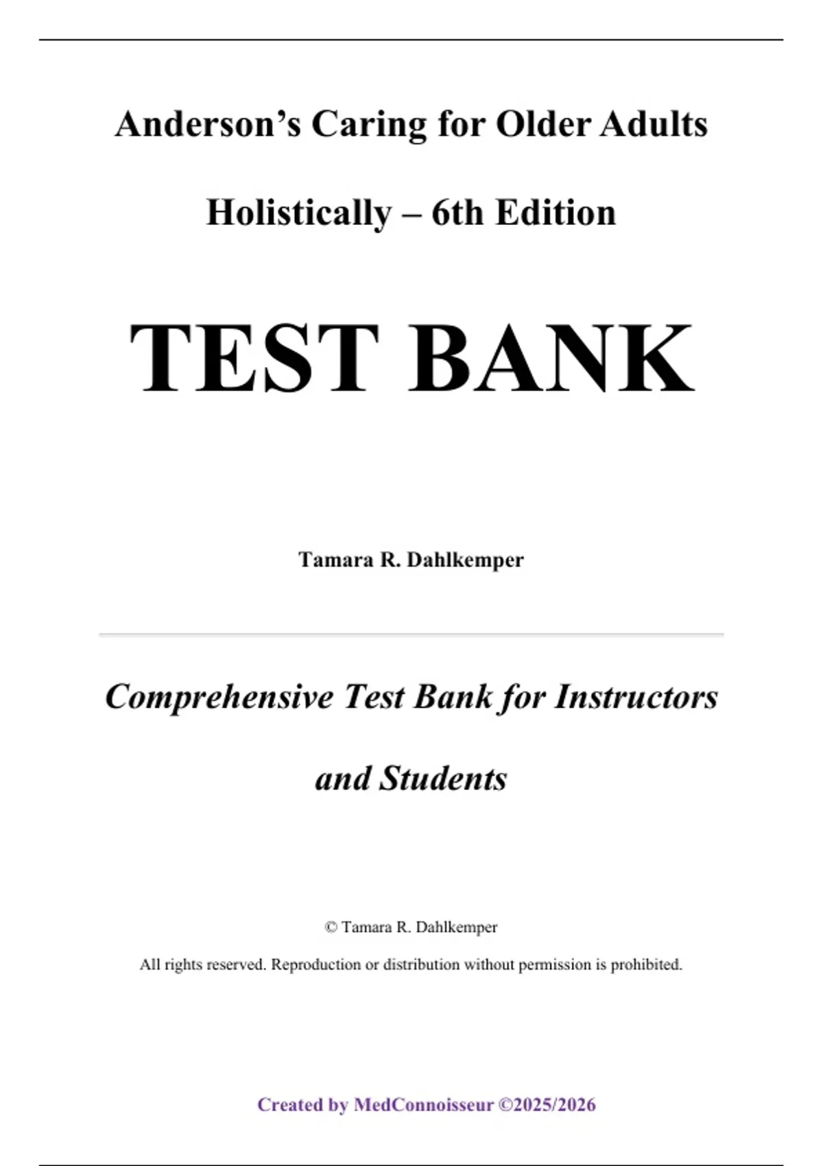 The Test Bank for Anderson’s Caring for Older Adults Holistically, 6th Edition by Tamara R. Dahlkemper is a fully verified assessment resource that aligns with the official F. A. Davis edition. It offers a complete range of question types — including multiple-choice, true/false, short-answer, and scenario-based items — covering all chapters and major topics. Designed to support instructors in creating quizzes, exams, and clinical practice evaluations with real-world relevance, legal/ethical issues, and holistic care perspectives. All Chapters include;.....I. Foundations of Care for the Older Adult — Chapter 1: Holistic Caring, Chapter 2: The Aging Experience, Chapter 3: Supporting Life Transitions and Spirituality in the Elderly, Chapter 4: The Use of the Nursing Process and Nursing Diagnosis in the Care of the Older Adult, Chapter 5: Legal, Ethical, and Financial Considerations Regarding Older Adults, Chapter 6: Promoting Wellness, Chapter 7: Safety (NEW!), Chapter 8: Nutrition for Older Adults, Chapter 9: Culturally Specific Care, Chapter 10: Activity, Rest, and Sleep as Criteria for Health, Chapter 11: End-of-Life Issues in Older Adults, Chapter 12: Environments of Care, Chapter 13: Management and Leadership Role of the Licensed Practical / Vocational Nurse. II. Clinical Practice — Chapter 14: Infection, Chapter 15: Common Medical Diagnoses, Chapter 16: Physiological Assessment, Chapter 17: Common Clinical Problems: Physiological, Chapter 18: Psychological Assessment, Chapter 19: Common Clinical Problems: Psychological, Chapter 20: Rehabilitation and Restorative Care, Chapter 21: Pharmacology and its Significance for Older Adults, Chapter 22: Laboratory Values and the Older Adult.