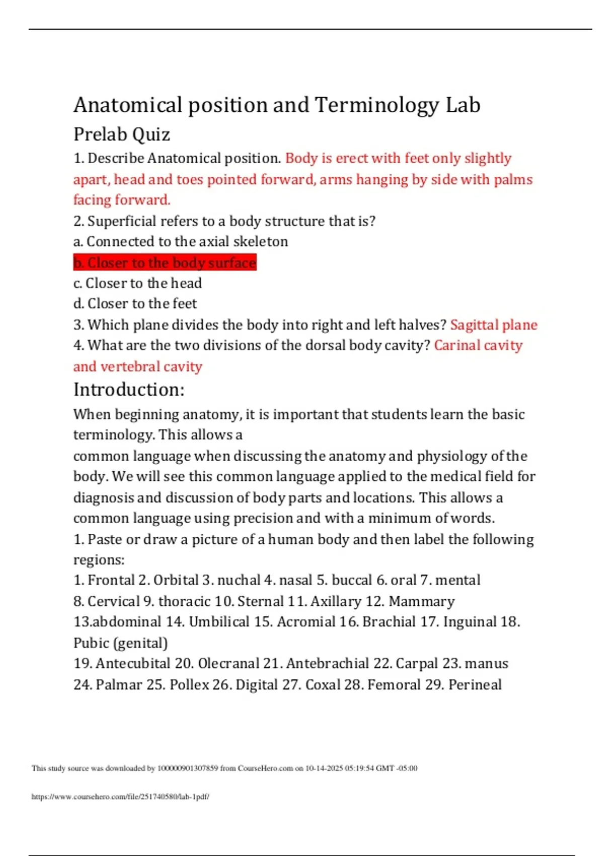 Anatomical position and Terminology Lab