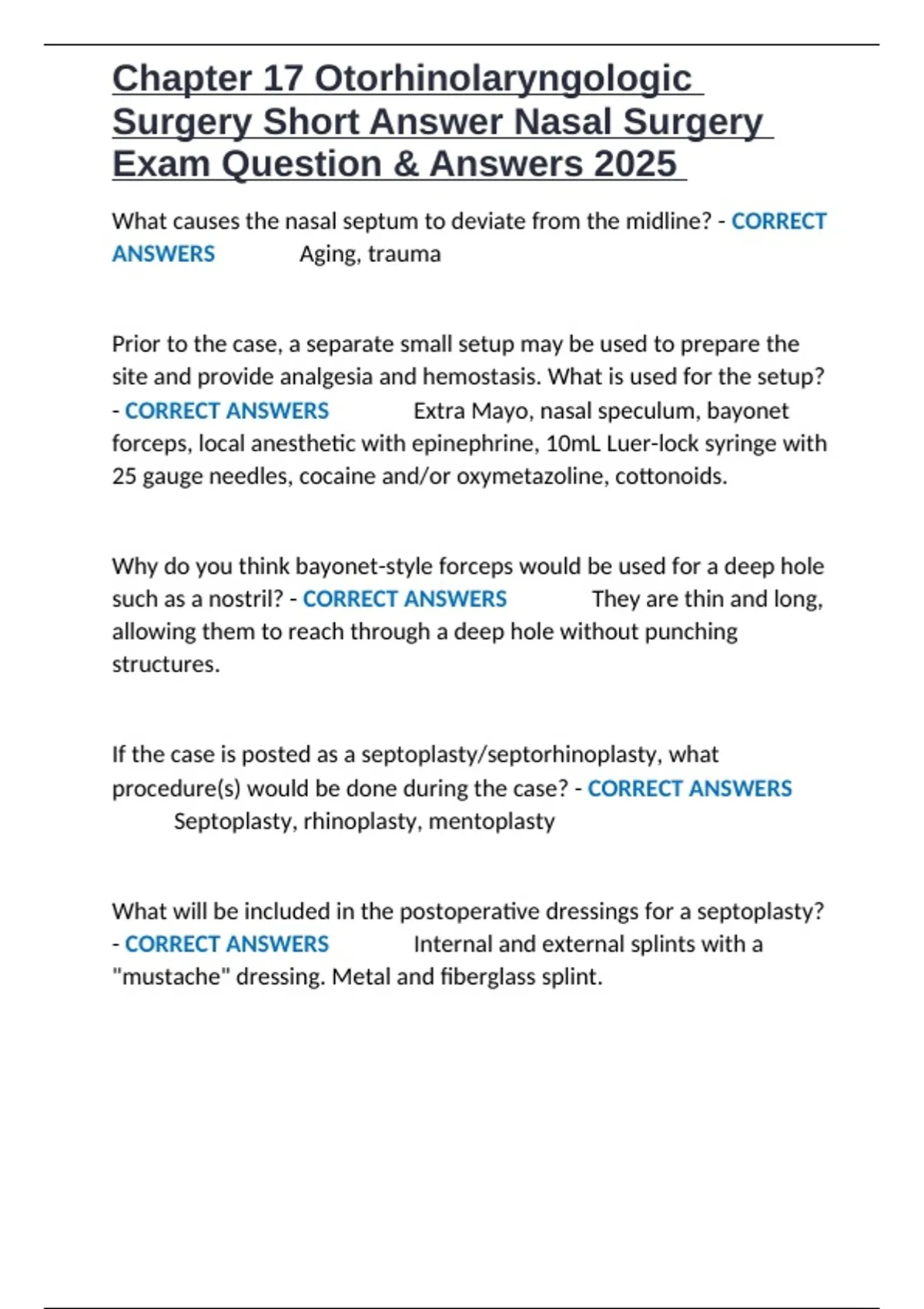 Chapter 17 Otorhinolaryngologic Surgery Short Answer Nasal Surgery Exam Question & Answers 2025.docx