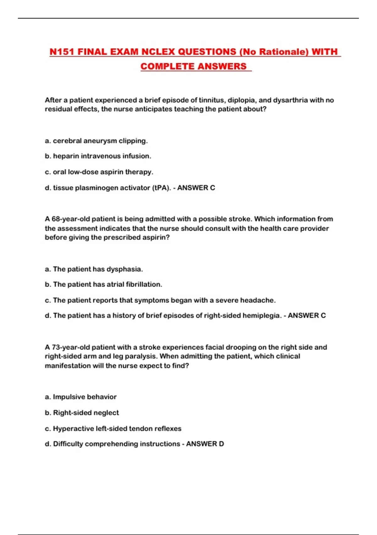 N151 FINAL EXAM NCLEX QUESTIONS (No Rationale) WITH COMPLETE ANSWERS ...