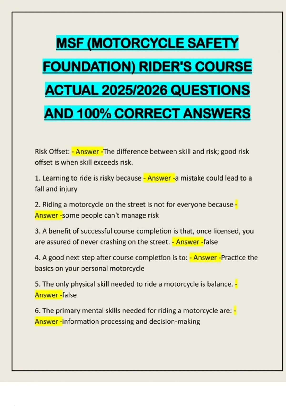 MSF (MOTORCYCLE SAFETY FOUNDATION) RIDER'S COURSE ACTUAL 2025/2026 QUESTIONS AND 100% CORRECT ANSWERS Risk Offset: - Answer -The difference between skill and risk; good risk offset is when skill exceeds risk. 1. Learning to ride is risky because - Answer -a mistake could lead to a fall and injury 2. Riding a motorcycle on the street is not for everyone because - Answer -some people can't manage risk 3. A benefit of successful course completion is that, once licensed, you are assured of never crashing on the street. - Answer -false 4. A good next step after course completion is to: - Answer -Practice the basics on your personal motorcycle 5. The only physical skill needed to ride a motorcycle is balance. - Answer -false 6. The primary mental skills needed for riding a motorcycle are: - Answer -information processing and decision-making7. You may opt out of the course if you become uncomfortable or feel unsafe. - Answer -true 8. A RiderCoach may counsel out riders who become too much of a risk to themselves or others. - Answer -true 1. Which of the following descriptions apply to Standard-type motorcycles? - Answer -naked bikes or roadsters. upright riding positions 2. Which of the following describes Cruiser-type motorcycles? - Answer -"Classic" styling 3. Which type of motorcycle features rear-positioned footrests, high power-to-weight ratio, and a forward leaning ride? - Answer -Sport 4. Sport-type motorcycles typically feature a higher than average power-to-weight ratio. - Answer -true 5. Which of the following motorcycle types is designed for riders focused on long-distance riding? - Answer -Touring 6. Touring-style motorcycles are designed primarily for riders who enjoy both highway and non-highway riding. - Answer -false 7. Because scooters have small engines, wearing a helmet is of little value. - Answer -false 8. All states use the same definitions, regulations, and requirements for motorcycles. - Answer -false 1. The throttle is operated: - Answer -By twisting the right handgrip 2. The clutch lever is operated by: - Answer -Squeezing a lever with the left hand3. The front brake lever is operated by the right foot. - Answer -false 4. The shift lever is operated by the left foot. - Answer -true 5. The control operated by the right hand is the: - Answer -Front brake lever 6. The control operated by the right foot is the shift lever. - Answer - false 7. The choke is used to: - Answer -Enri