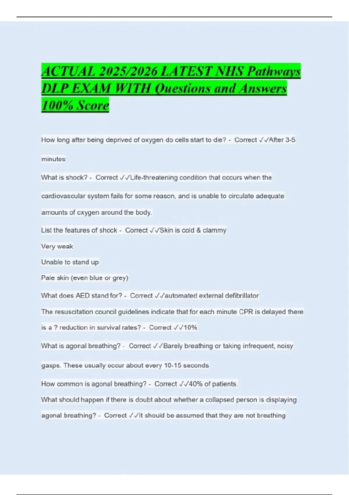 ACTUAL 2025/2026 LATEST NHS Pathways DLP EXAM WITH Questions and Answers 100% Score How long after being deprived of oxygen do cells start to die? - Correct After 3-5 minutes What is shock? - Correct Life-threatening condition that occurs when the cardiovascular system fails for some reason, and is unable to circulate adequate amounts of oxygen around the body. List the features of shock - Correct Skin is cold & clammy Very weak Unable to stand up Pale skin (even blue or grey) What does AED stand for? - Correct automated external defibrillator