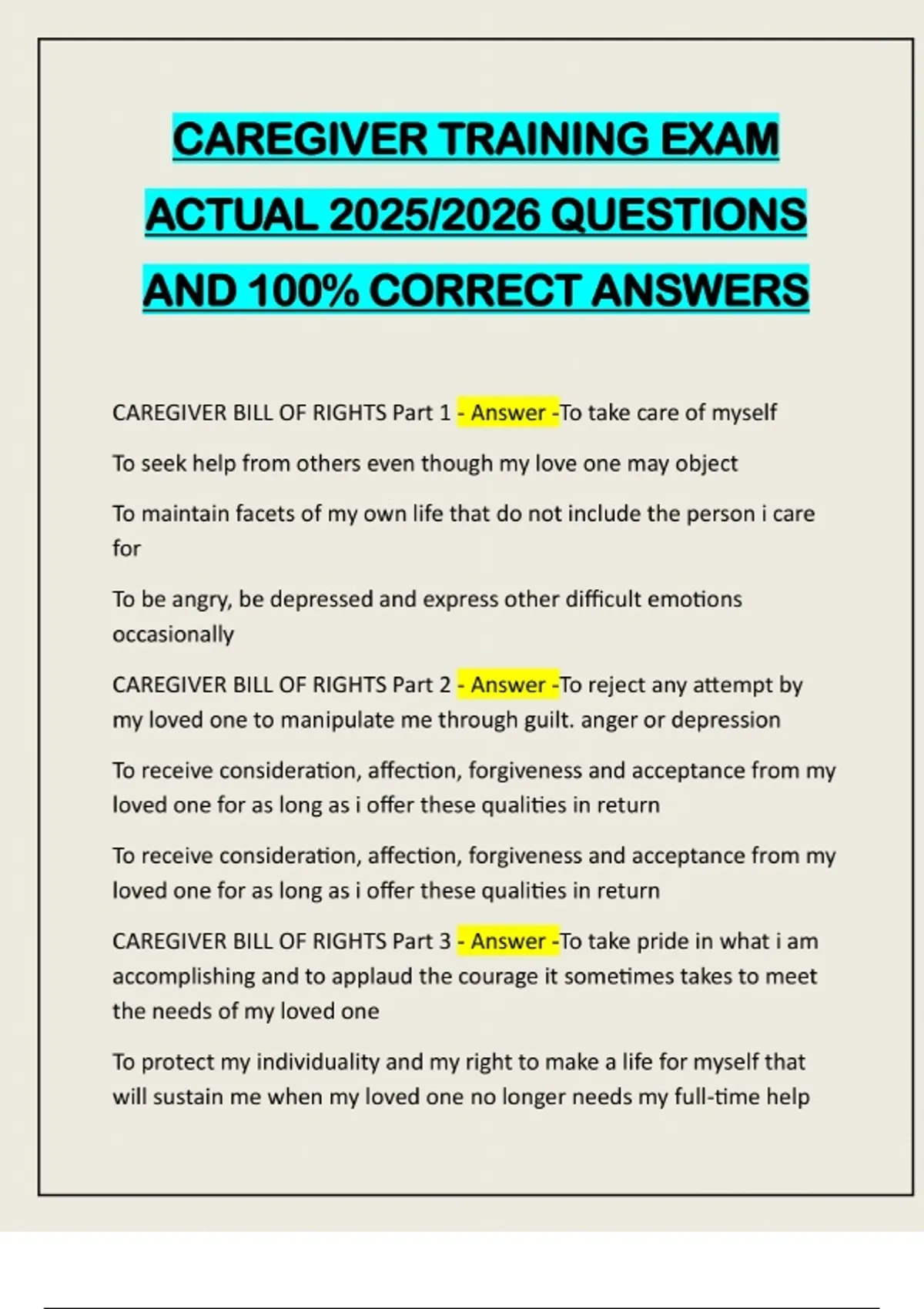 CAREGIVER TRAINING EXAM ACTUAL 2025/2026 QUESTIONS AND 100% CORRECT ANSWERS CAREGIVER BILL OF RIGHTS Part 1 - Answer -To take care of myself To seek help from others even though my love one may object To maintain facets of my own life that do not include the person i care for To be angry, be depressed and express other difficult emotions occasionally CAREGIVER BILL OF RIGHTS Part 2 - Answer -To reject any attempt by my loved one to manipulate me through guilt. anger or depression To receive consideration, affection, forgiveness and acceptance from my loved one for as long as i offer these qualities in return To receive consideration, affection, forgiveness and acceptance from my loved one for as long as i offer these qualities in return