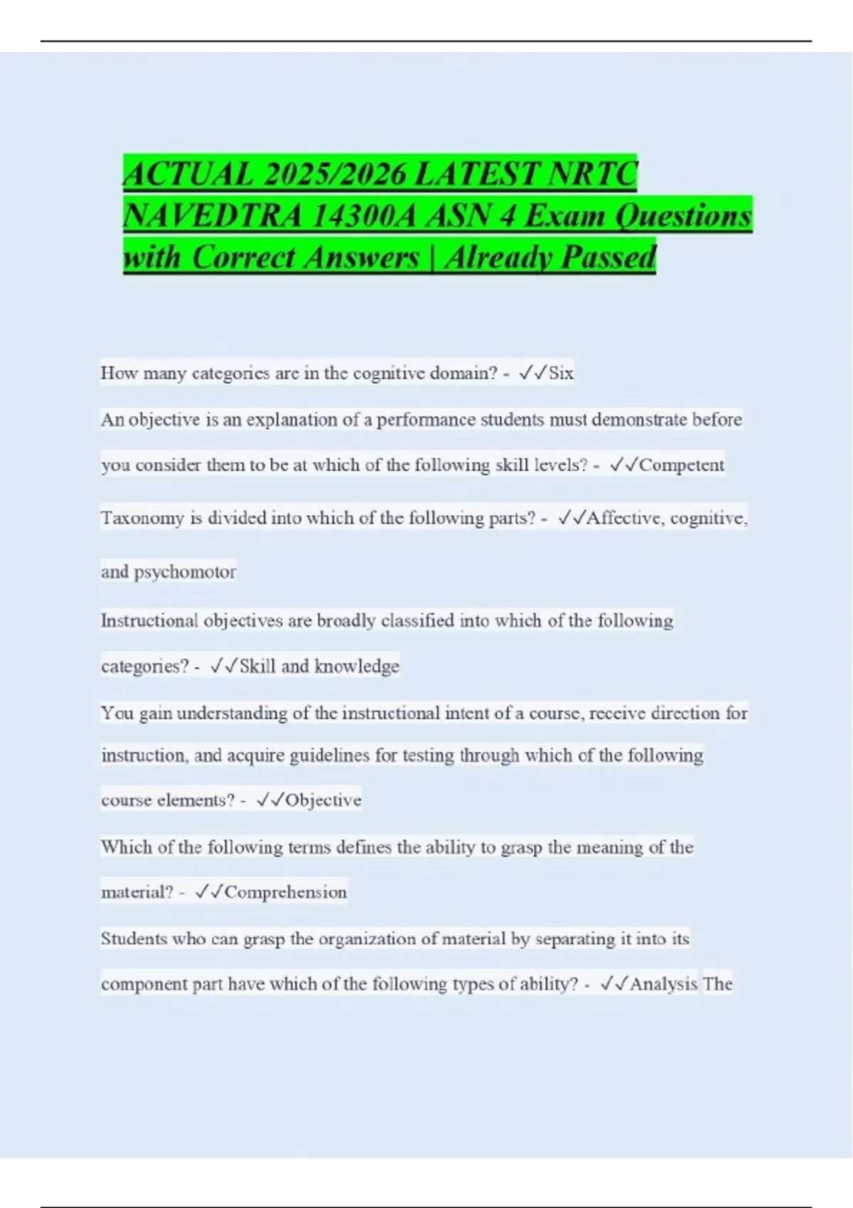 ACTUAL 2025/2026 LATEST NRTC NAVEDTRA 14300A ASN 4 Exam Questions with Correct Answers | Already Passed How many categories are in the cognitive domain? - Six An objective is an explanation of a performance students must demonstrate before you consider them to be at which of the following skill levels? - Competent Taxonomy is divided into which of the following parts? - Affective, cognitive, and psychomotor Instructional objectives are broadly classified into which of the following categories? - Skill and knowledge You gain understanding of the instructional intent of a course, receive direction for instruction, and acquire guidelines for testing through which of the following course elements? - Objective