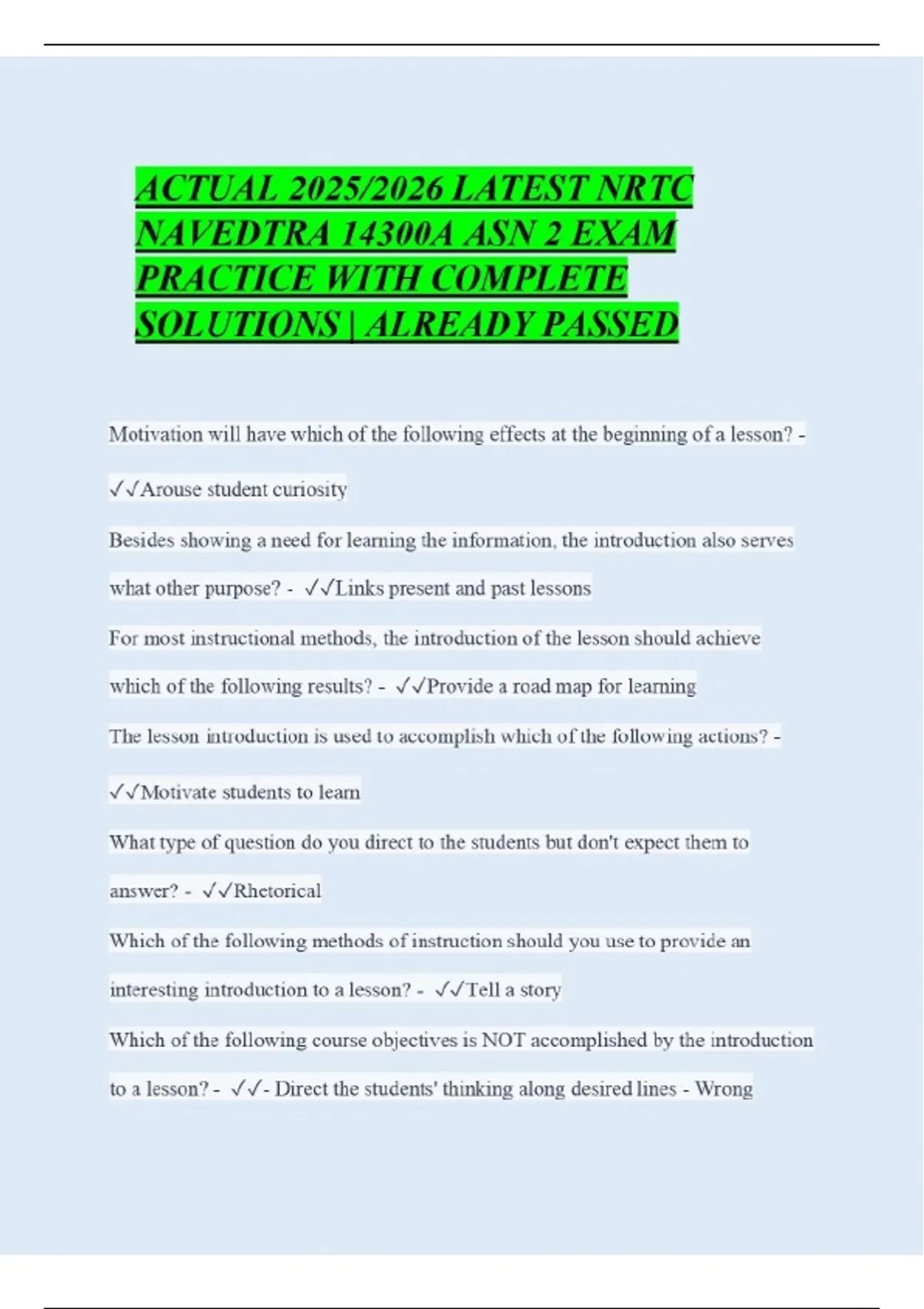 ACTUAL 2025/2026 LATEST NRTC NAVEDTRA 14300A ASN 2 EXAM PRACTICE WITH COMPLETE SOLUTIONS | ALREADY PASSED Motivation will have which of the following effects at the beginning of a lesson? - Arouse student curiosity Besides showing a need for learning the information, the introduction also serves what other purpose? - Links present and past lessons For most instructional methods, the introduction of the lesson should achieve which of the following results? - Provide a road map for learning The lesson introduction is used to accomplish which of the following actions? - Motivate students to learn What type of question do you direct to the students but don't expect them to answer? - Rhetorical