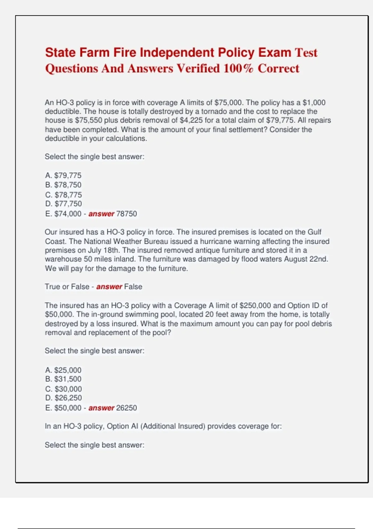 An HO-3 policy is in force with coverage A limits of $75,000. The policy has a $1,000