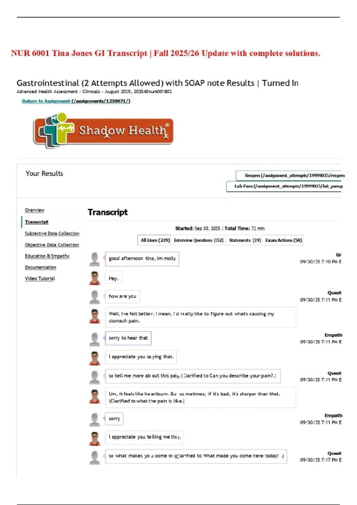 NUR 6001 Tina Jones GI Transcript | Fall 2025/26 Update with complete solutions.