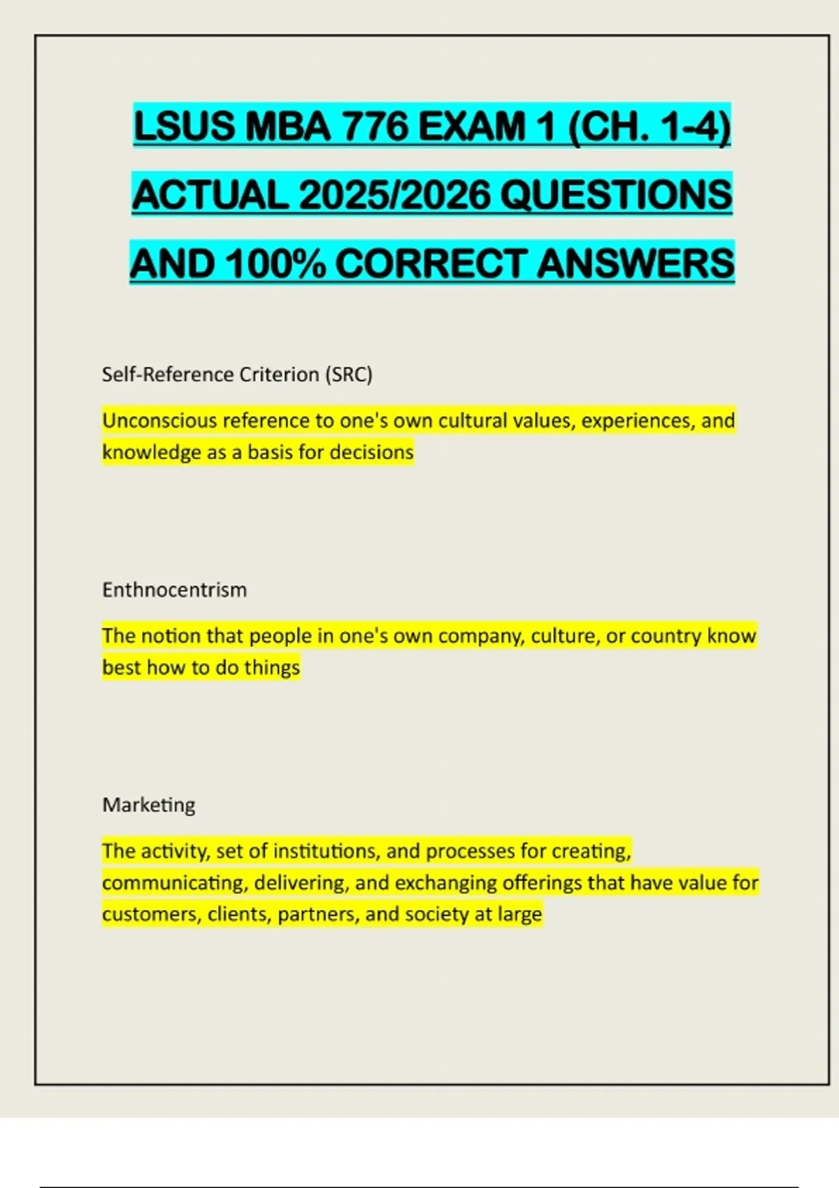 LSUS MBA 776 EXAM 1 (CH. 1-4) ACTUAL 2025/2026 QUESTIONS AND 100% CORRECT ANSWERS Self-Reference Criterion (SRC) Unconscious reference to one's own cultural values, experiences, and knowledge as a basis for decisions Enthnocentrism The notion that people in one's own company, culture, or country know best how to do things Marketing The activity, set of institutions, and processes for creating, communicating, delivering, and exchanging offerings that have value for customers, clients, partners, and society at largeInternational Marketing The performance of business activities designed to plan, price, promote, and direct the flow of a company's goods and services to consumers or users in more than one nation for a profit. Adaptation - The ability to interpret effectively the influence and impact of each of the uncontrollable environmental elements on the marketing plan for each foreign market in which they hope to do business. - Cultural adjustment: the most challenging and important task Duties of international marketers - Interpret influence of each uncontrollable element on market. - Adjust marketing efforts to cultures in which they are not attuned. - Be aware of own frame of reference when evaluating markets.• Often based off acculturation in home country. Stages of International Marketing Involvement More reactive and less strategic 1. No Direct Foreign Marketing 2. Infrequent Foreign Marketing More involved in strategic planning 3. Regular Foreign Marketing 4. International Marketing 5. Global Marketing