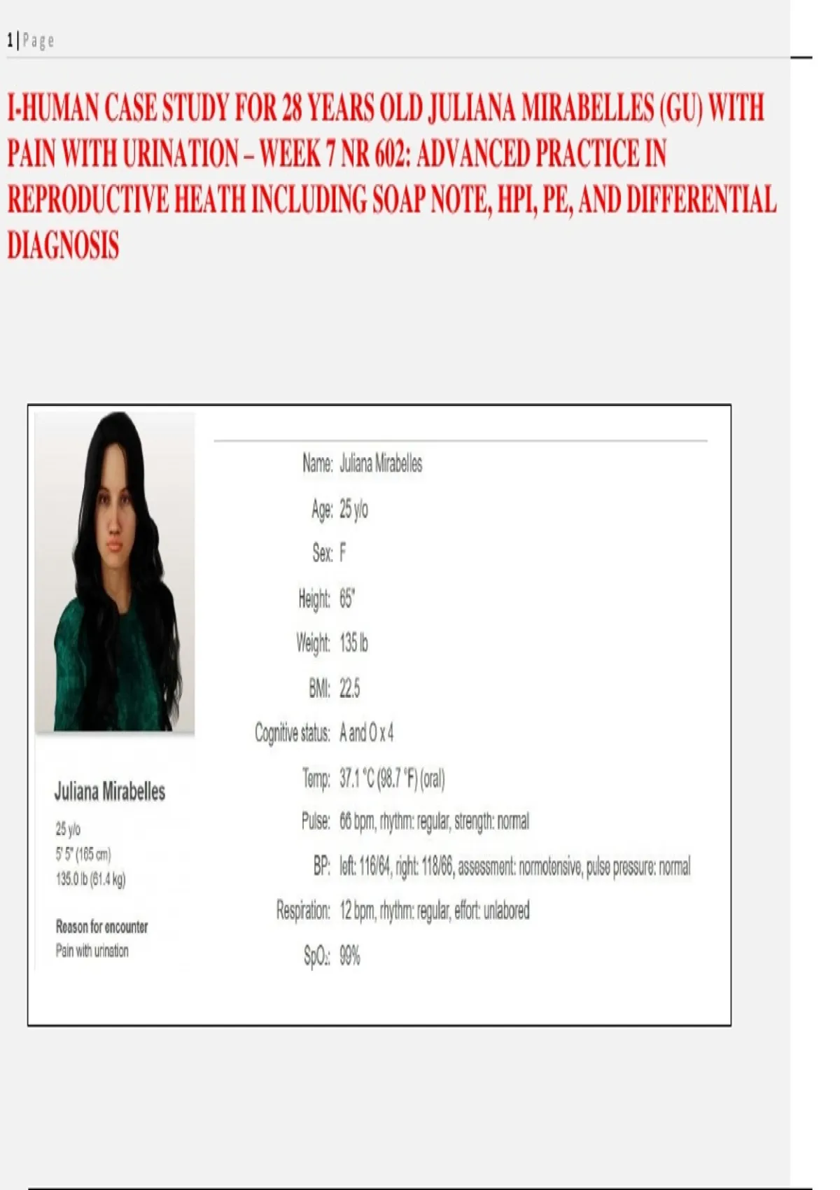 I-HUMAN CASE STUDY FOR 28 YEARS OLD JULIANA MIRABELLES (GU) WITH PAIN WITH URINATION – WEEK 7 NR 602: ADVANCED PRACTICE IN REPRODUCTIVE HEATH INCLUDING SOAP NOTE, HPI, PE, AND DIFFERENTIAL DIAGNOSIS