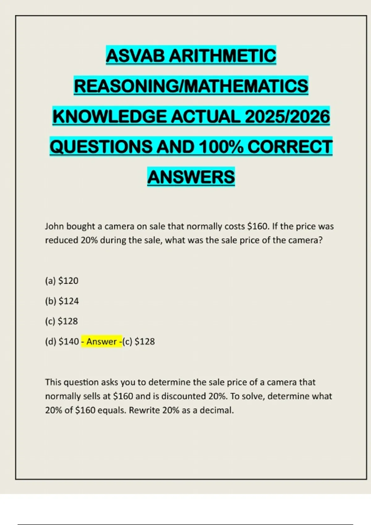 ASVAB ARITHMETIC REASONING/MATHEMATICS KNOWLEDGE ACTUAL 2025/2026 QUESTIONS AND 100% CORRECT ANSWERS John bought a camera on sale that normally costs $160. If the price was reduced 20% during the sale, what was the sale price of the camera? (a) $120 (b) $124 (c) $128 (d) $140 - Answer -(c) $128 This question asks you to determine the sale price of a camera that normally sells at $160 and is discounted 20%. To solve, determine what 20% of $160 equals. Rewrite 20% as a decimal.20% = 0.20. So 20% of $160 = 0.20 x $160 = $32. The sale price of the camera would be $160 - $32 = $128, choice (c) A subway car passes 3 stations every 10 minutes. At this rate, how many stations will it pass in one hour? (a) 15 (b) 18 (c) 20 (d) 30 - Answer -(b) 18 First, set up the rate as a proportion, where (x) is the number of stations. 3 stations/10 minutes = (x) stations/1 hour Then, convert the units. 3 stations/10 minutes = (x) stations/60 minutes Cross multiply and solve for (x).180 = 10(x) 18 = (x) On a certain map, 3/4 inch represents one mile. What distance, in miles, is presented by 1 3/4 inches? (a) 1 1/2 (b) 2 1/3 (c) 2 1/2 (d) 5 1/4 - Answer -(b) 2 1/3 In this question, the ratio is implied: for every 3/4 inch of map there is 1 real mile, so the ratio of inches to the miles they represent is always 3/4 to 1. Therefore, you can set up the proportion: number of inches/ number of miles = 3/4 / 1 = 3/4 Now 1 3/4 inches = 7/4 inches. Set up a proportion:7/4 inches 7/4 inches / number of miles = 3/4 Cross-multiply: 7/4(4) = 3 (number of miles) 7= 3(number of miles) 7/3 = number of miles or 2 1/3 = number of miles A certain box contains baseballs and golf balls. If the ratio of baseballs to golf balls is 2:3 and there are 30 baseballs in the box, how many golf balls are in the box? (a) 18 (b) 20 (c) 36 (d) 45 - Answer -(d) 45
