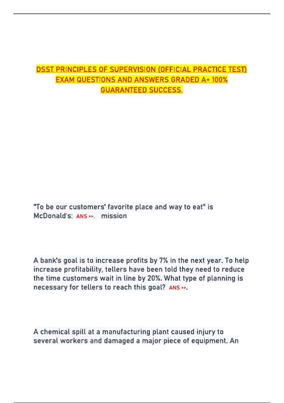 This document includes the official DSST Principles of Supervision practice test with detailed questions and accurate answers. It covers all key areas of supervision, including leadership styles, motivation, communication, team dynamics, decision-making, and conflict resolution. Designed to mirror the actual DSST exam format, this resource helps students understand essential management concepts and prepare effectively for the test. Fully updated and graded A+, it ensures thorough preparation and confidence for exam success.