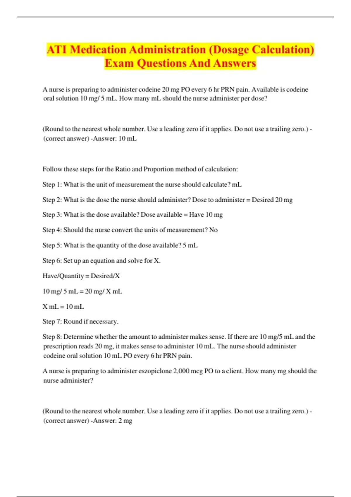 This ATI Medication Administration (Dosage Calculation) Exam study guide includes comprehensive practice questions with accurate answers and detailed step-by-step explanations