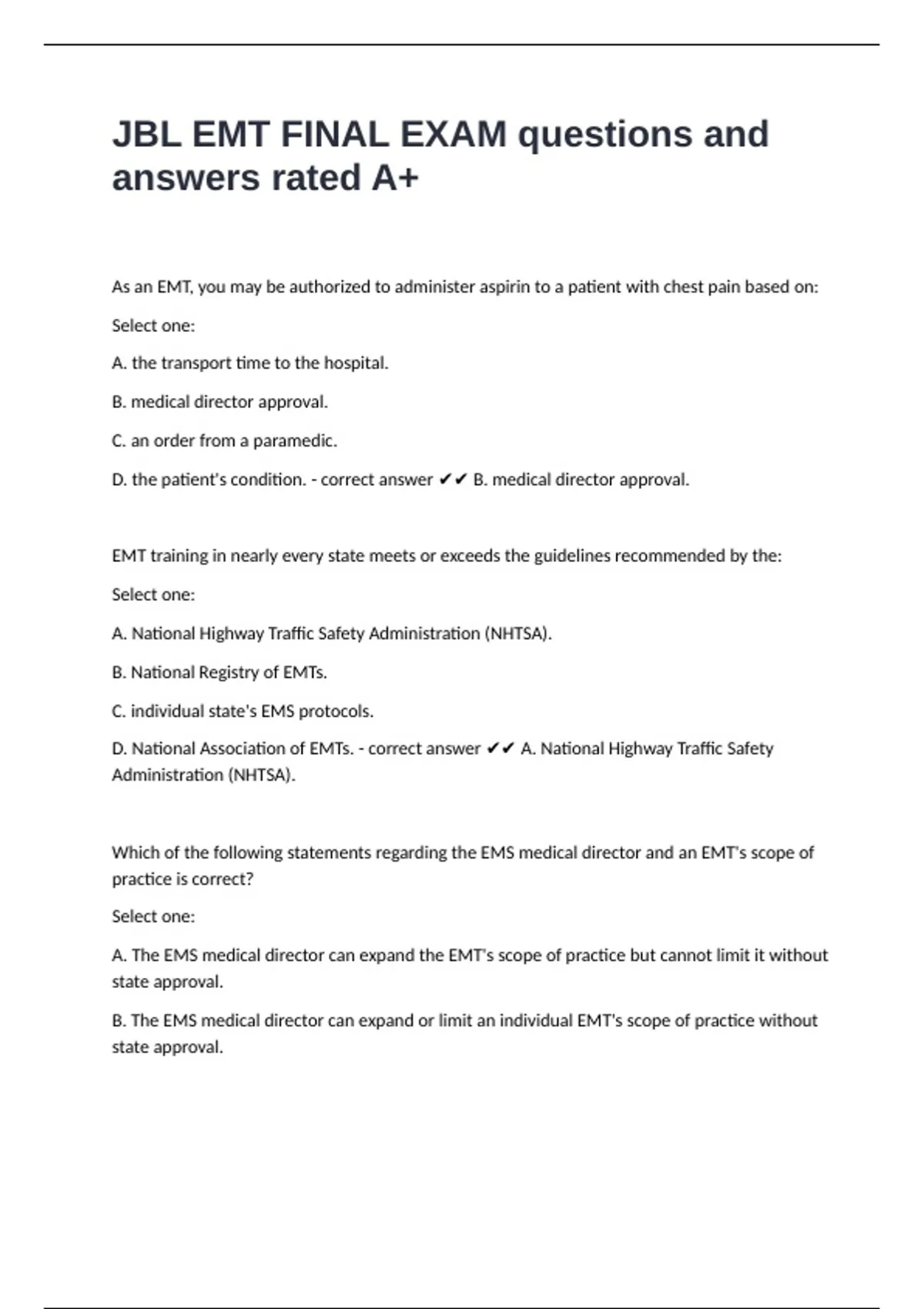 JBL EMT FINAL EXAM questions and answers rated A+