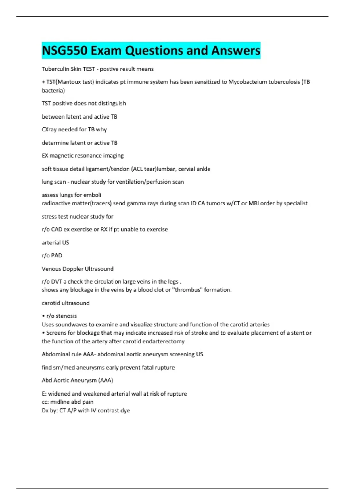 NSG550 Exam Questions and Answers Tuberculin Skin TEST - postive result means + TST(Mantoux test) indicates pt immune system has been sensitized to Mycobacteium tuberculosis (TB bacteria) TST positive does not distinguish between latent and active TB CXray needed for TB why determine latent or active TB EX magnetic resonance imaging soft tissue detail ligament/tendon (ACL tear)lumbar, cervial ankle lung scan - nuclear study for ventilation/perfusion scan