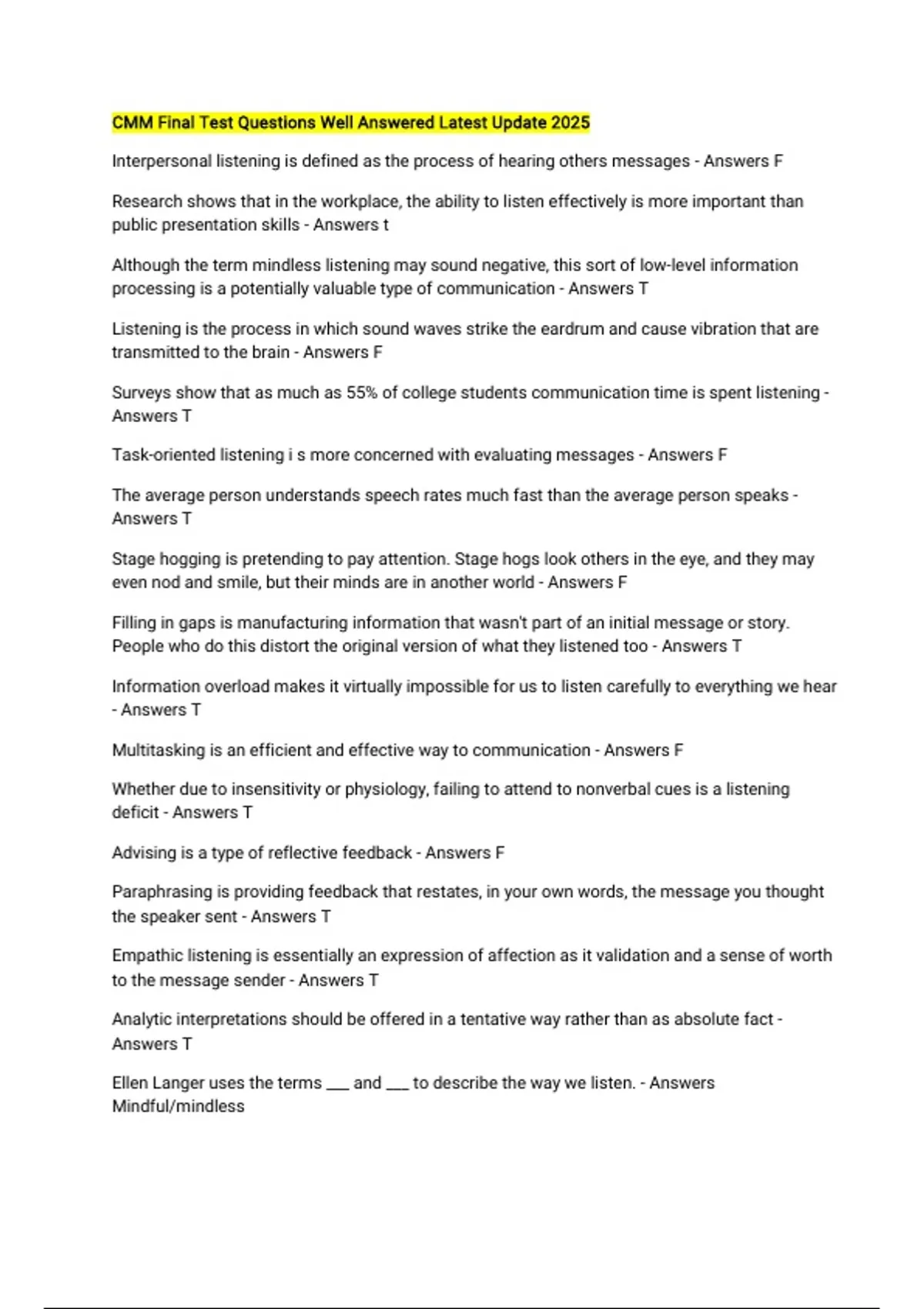 CMM Final Test Questions Well Answered Latest Update 2025 Interpersonal listening is defined as the process of hearing others messages - Answers F Research shows that in the workplace, the ability to listen effectively is more important than public presentation skills - Answers t Although the term mindless listening may sound negative, this sort of low-level information processing is a potentially valuable type of communication - Answers T Listening is the process in which sound waves strike the eardrum and cause vibration that are transmitted to the brain - Answers F Surveys show that as much as 55% of college students communication time is spent listening - Answers T Task-oriented listening i s more concerned with evaluating messages - Answers F The average person understands speech rates much fast than the average person speaks - Answers T Stage hogging is pretending to pay attention. Stage hogs look others in the eye, and they may even nod and smile, but their minds are in another world - Answers F Filling in gaps is manufacturing information that wasn't part of an initial message or story. People who do this distort the original version of what they listened too - Answers T Information overload makes it virtually impossible for us to listen carefully to everything we hear - Answers T Multitasking is an efficient and effective way to communication - Answers F Whether due to insensitivity or physiology, failing to attend to nonverbal cues is a listening deficit - Answers T Advising is a type of reflective feedback - Answers F Paraphrasing is providing feedback that restates, in your own words, the message you thought the speaker sent - Answers T Empathic listening is essentially an expression of affection as it validation and a sense of worth to the message sender - Answers T Analytic interpretations should be offered in a tentative way rather than as absolute fact - Answers T Ellen Langer uses the terms ___ and ___ to describe the way we listen. - Answers Mindful/mindless Interpersonal listening i s defined as the process of receiving and ___ others messages. - Answers Responding to How does listening differ from hearing? - Answers Listening occurs when the brain reconstructs electrochemical impulses into a representation of the original sound and then gives a meaning Which adjective would be most closely associated with mindful listening? - Answers Thoughtful Troubled by conflict with a colleague at work, Daksha decides to discuss the issue with his manager, Nathan. In their convo, Nathan urges Daksha to get to the point and concisely explain how this situation might affect the project deadline. Nathan is a(n) ___ listner. - Answers Task-oriented Which type of listener is more likely to draw out responses from the message-sender? - Answers Relational A bombardment of messages in face-to-face interaction, and from the Internet, the media, cell phones and other sources constitutes which barrier to listening? - Answers Information overload Susan's English professor thinks that she is always listening to her lectures because she makes eye contact, nods, and take notes. In reality, Susan is using the class time to catch up on her personal diary. Susan is guilty of ___ - Answers Pseudolistening Friends have told Spencer that they've seen his girlfriend on what looked like dates with someone else, but Spencer never seems to hear what they are saying. SPencer is likely a(n) ____ - Answers Insulated listener Although we're capable of understanding speech at rates up to 600 words per minute, the average person speaks much more slowly, around ___ words per minute. - Answers 100/140 The first component in the process of listening is ___ - Answers Hearing When discussing where they should eat out, Angela says she would like to go somewhere nice for a change. Stephen responds with sarcasm as he thinks Angela is implying that he is cheap when in fact she just got a raise and simply wants to celebrate. This exchange illustrates a low degree of ___ - Answers Listening fidelity How do a supporting response and an evaluating response differ? - Answers An evaluating response is more directive and less reflective A counterfeit question is one that ____ - Answers Sends a disguised message Wow, is sounds like you had a busy day. - Answers Empathizing I think you should go and talk to him about it. - Answers Advising I think she is behaving like that because she isn't feeling well. - Answers Analyzing That's a good point. - Answers Evaluating I remember when you had a similar situation, you dealt with it really well. - Answers Supporting Daniel Golemans concept of emotional intelligence refers to the ability to understand and manage ones own emotions and to be sensitive to others feelings. - Answers t Research shows that suppressing ones feelings is vastly superior to reappraisal. - Answers f The physiological changes associated with fear are similar to those that accompany excitement, joy and other emotions - Answers t
