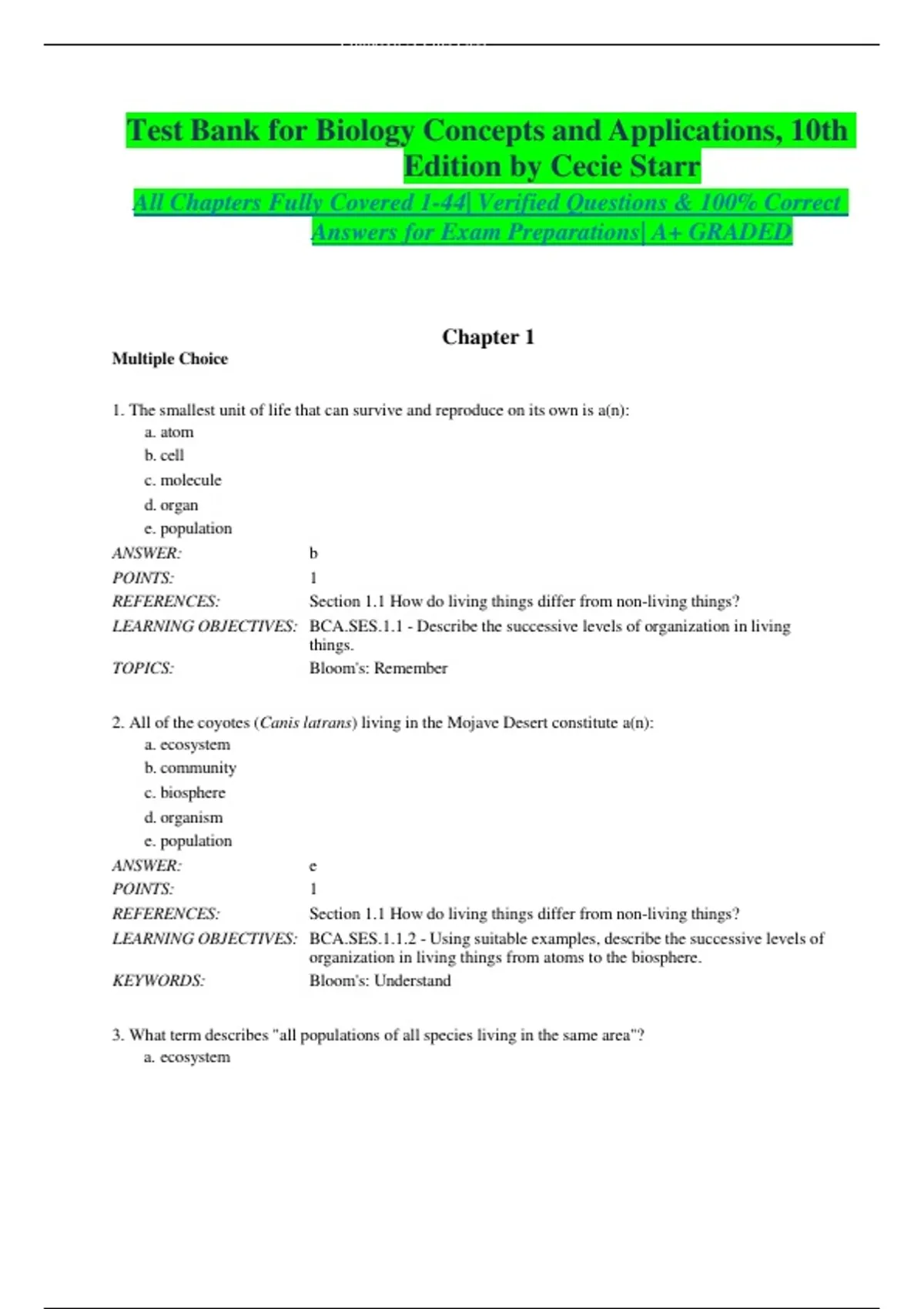 Test Bank for Biology Concepts and Applications, 10th