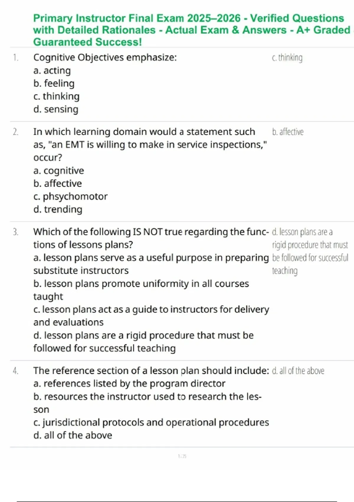 Master your Primary Instructor Final Exam with this verified and updated 2025–2026 study resource! – Includes comprehensive, real exam-style questions and 100% correct answers, all reviewed and graded A+ for accuracy and reliability. – Covers essential instructional strategies, classroom management, curriculum planning, and evaluation techniques aligned with current education standards. – Perfect for educators, trainers, and teaching professionals preparing for certification or advancement. – Study confidently, save time, and ensure guaranteed success with this trusted and complete Primary Instructor Final Exam guide!