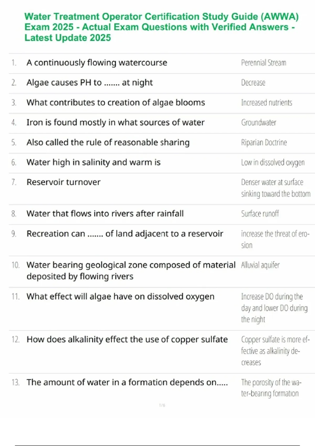 Prepare thoroughly for your Water Treatment Operator Certification Exam (AWWA) 2025 with this verified and updated study guide, featuring actual exam questions and accurate answers. – Covers key topics such as water treatment processes, distribution systems, safety protocols, regulatory compliance, and troubleshooting techniques. – Each question is reviewed and verified to match the latest 2025 AWWA standards, ensuring reliable and effective preparation. – Perfect for water operators seeking certification or license renewal, this A+ graded guide provides comprehensive knowledge, boosts confidence, and guarantees success on your exam.