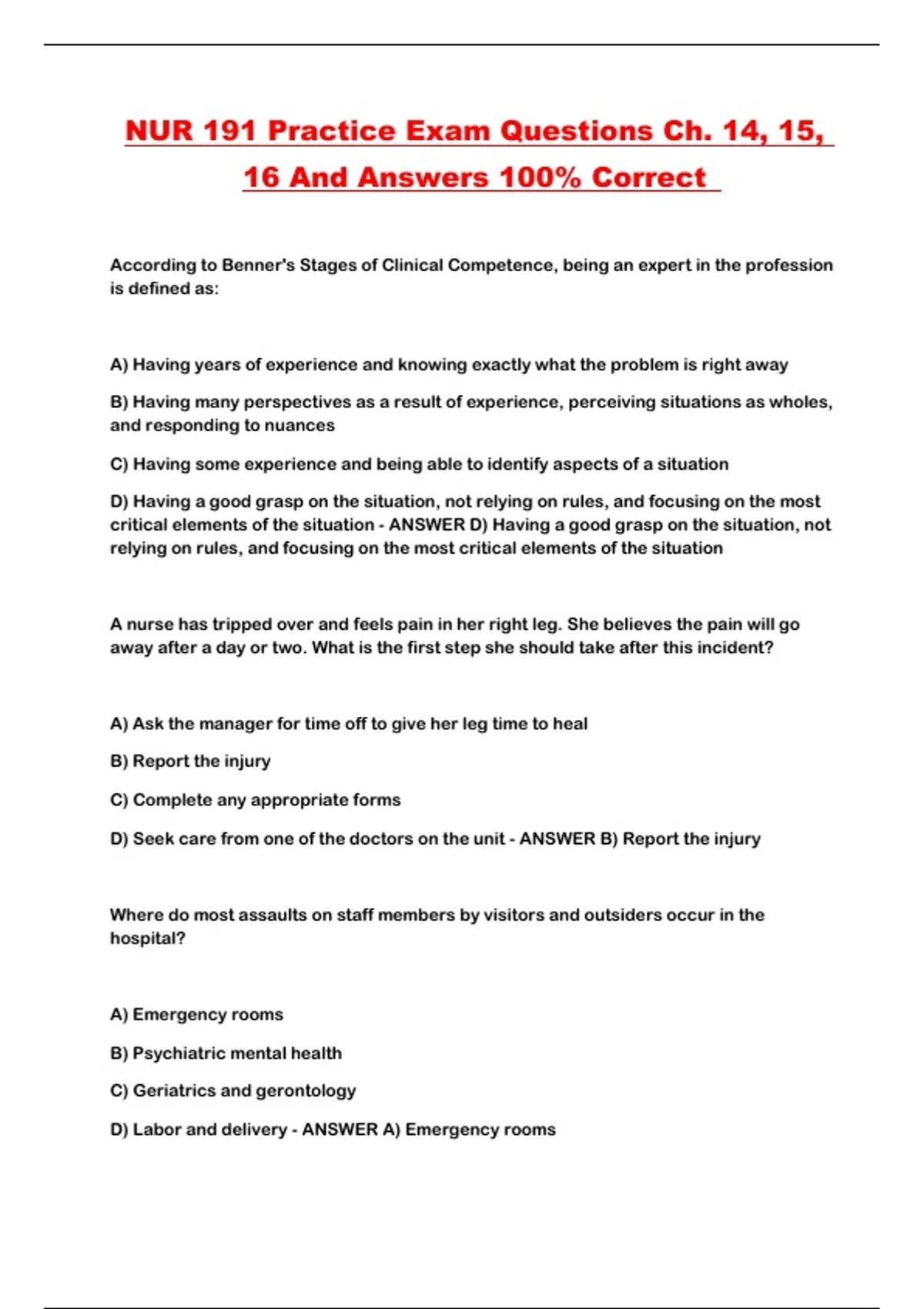 NUR 191 Practice Exam Questions Ch. 14, 15,