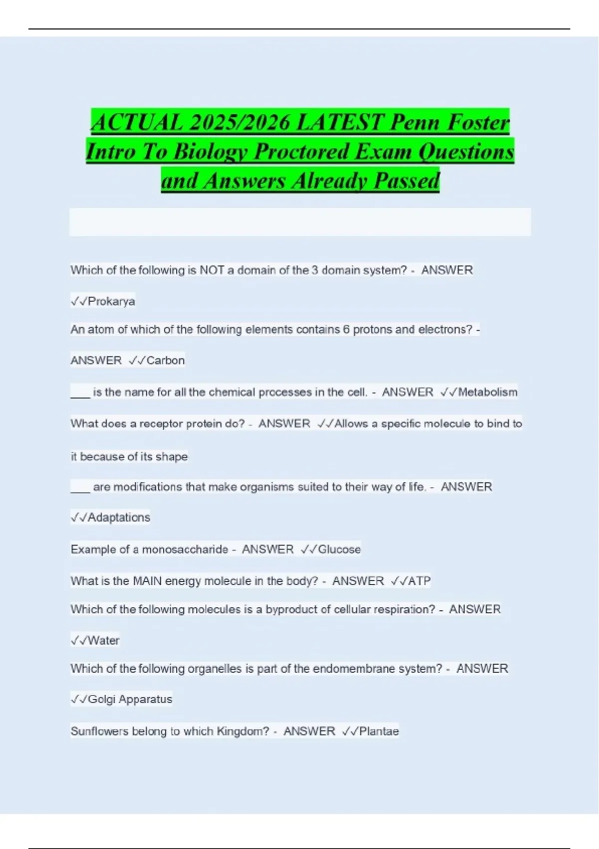 ACTUAL 2025/2026 LATEST Penn Foster Intro To Biology Proctored Exam Questions and Answers Already Passed