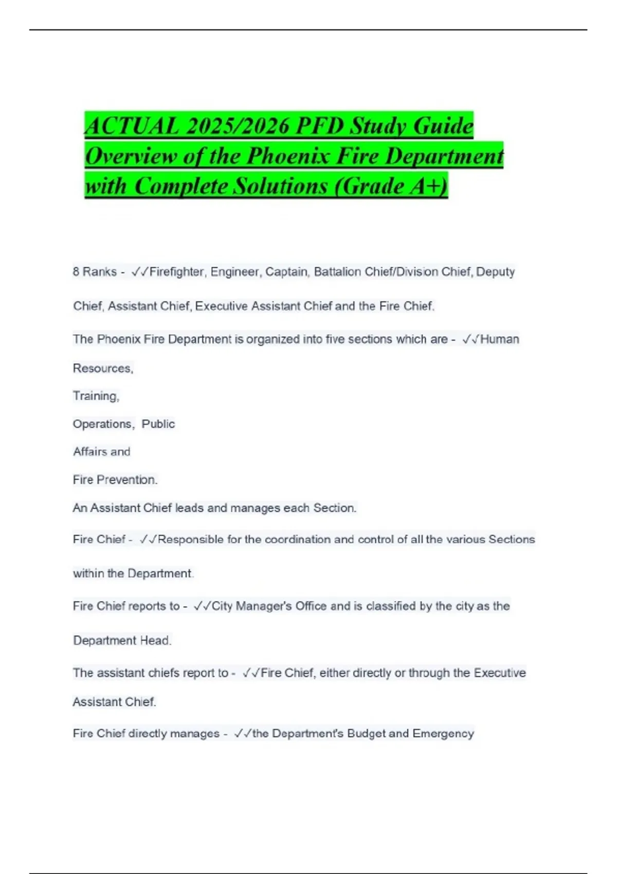 ACTUAL 2025/2026 PFD Study Guide Overview of the Phoenix Fire Department with Complete Solutions (Grade A+) 8 Ranks - Firefighter, Engineer, Captain, Battalion Chief/Division Chief, Deputy Chief, Assistant Chief, Executive Assistant Chief and the Fire Chief. The Phoenix Fire Department is organized into five sections which are - Human Resources, Training, Operations, Public Affairs and Fire Prevention. An Assistant Chief leads and manages each Section. Fire Chief - Responsible for the coordination and control of all the various Sections within the Department. Fire Chief reports to - City Manager's Office and is classified by the city as the Department Head.