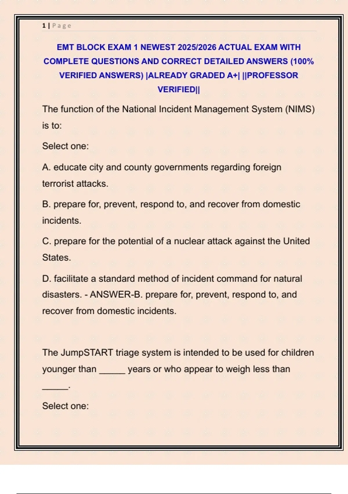 EMT BLOCK EXAM 1 NEWEST 2025/2026 ACTUAL EXAM WITH COMPLETE QUESTIONS AND CORRECT DETAILED ANSWERS (100% VERIFIED ANSWERS) |ALREADY GRADED A+| ||PROFESSOR VERIFIED||