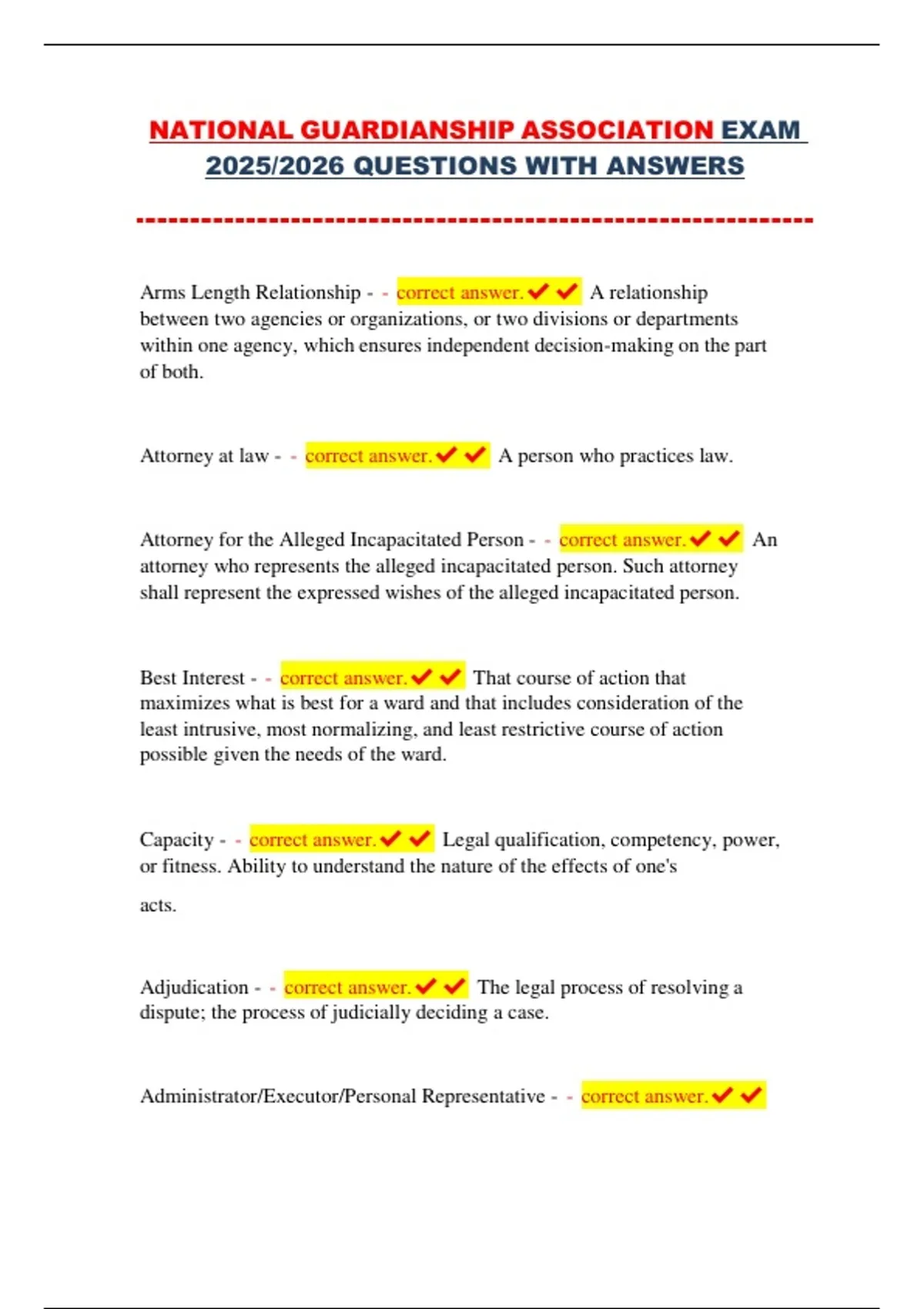This document contains the full set of official-style practice questions and verified answers for the 2025/2026 National Guardianship Association (NGA) Certification Exam. It covers key guardianship concepts including legal definitions, ethical standards, guardian responsibilities, fiduciary duties, informed consent, decision-making principles (best interest and substituted judgment), and professional standards of practice. Also included are scenario-based questions that reflect real-world guardianship challenges, ensuring comprehensive exam preparation for certification candidates.