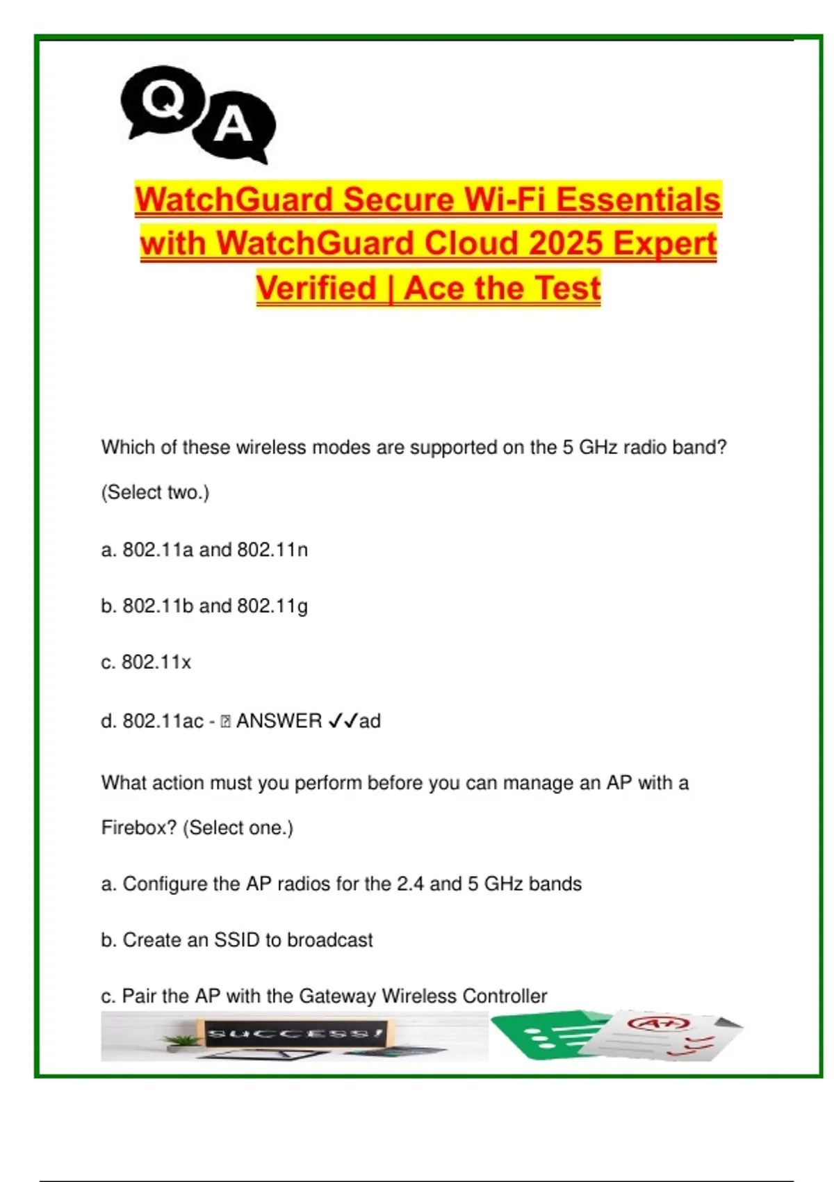 This document provides 80+ verified and solved exam questions from the WatchGuard Secure Wi-Fi Essentials 2025/2026 certification, covering critical wireless security and deployment topics for WatchGuard-managed and cloud-managed environments. It is designed as a practical and exam-focused guide for IT professionals, network engineers, and students preparing for WatchGuard wireless certifications. Covered topics include: Wireless Access Points (APs): AP models, deployment methods, cloud vs. local management SSID Configuration: VLAN tagging, SSID-to-VLAN mapping, security types (WPA2/WPA3, 802.1X, PSK), and hidden SSIDs WatchGuard Wi-Fi Cloud Management: Discover, Manage, Analyze tools; template-based configuration Wireless Intrusion Prevention System (WIPS): rogue AP detection, prevention policies, wireless client behavior monitoring Radio Settings: band steering, 2.4GHz vs. 5GHz tuning, RF planning Authentication and Access Control: captive portals, splash pages, MAC-based access, guest networks Traffic Management: bandwidth controls, prioritization of services, device throttling Logging and Monitoring: device health, connection reports, client session logging This guide is ideal for: Students in cybersecurity or network administration programs WatchGuard Secure Wi-Fi certification candidates IT professionals deploying WatchGuard APs in small, medium, or enterprise networks System integrators and MSPs using WatchGuard Wi-Fi solutions in managed environments Keywords: WatchGuard Wi-Fi, secure wireless, access point setup, VLAN tagging, rogue AP detection, WIPS, SSID configuration, Wi-Fi cloud management, WPA3, guest Wi-Fi, splash page, captive portal, RF planning, band steering, bandwidth limits, wireless security, Wi-Fi exam prep, network administrator, WatchGuard cloud, Wi-Fi Essentials