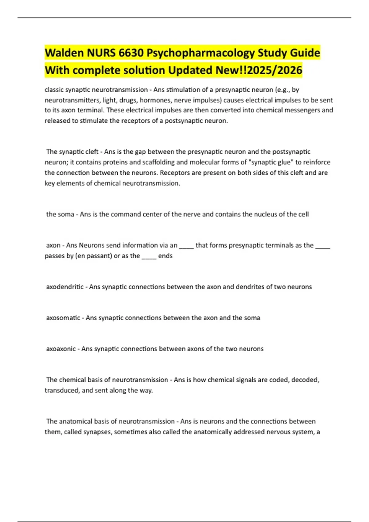 Walden NURS 6630 Psychopharmacology Study Guide With complete solution Updated New!!2025/2026