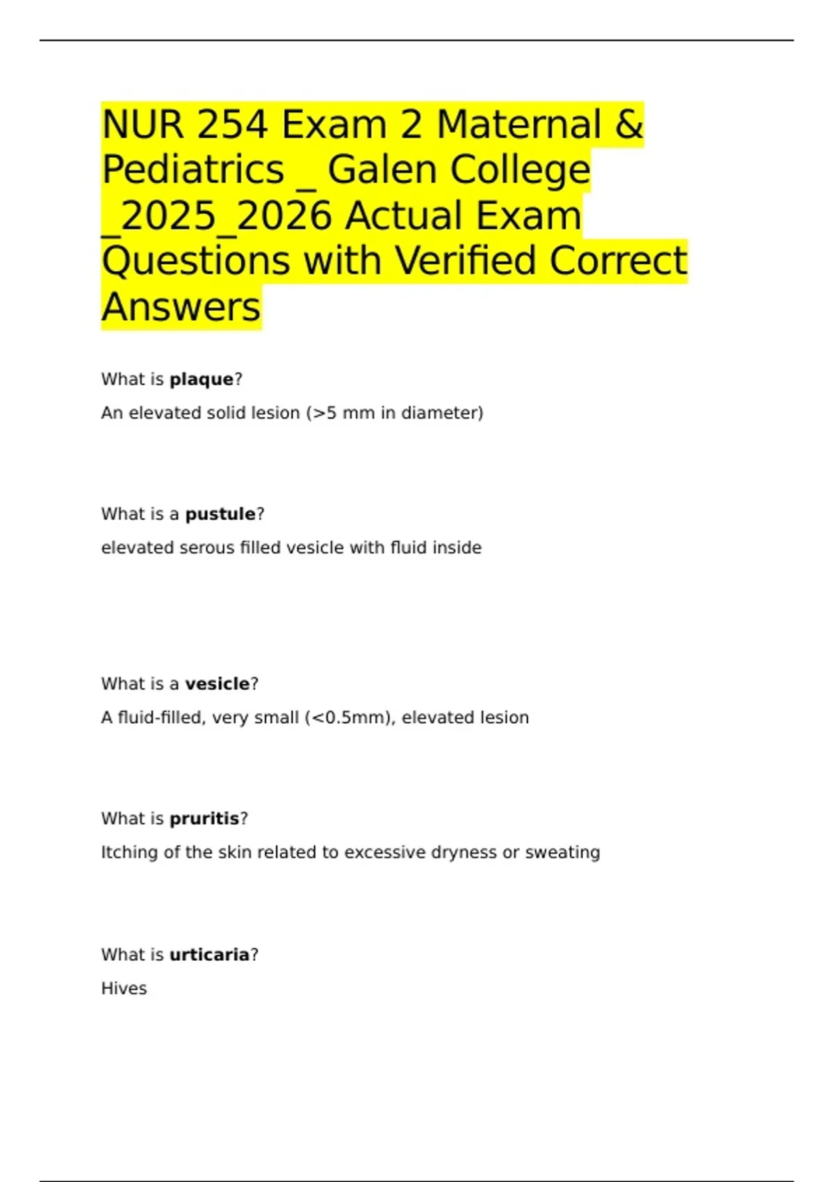 NUR 254 Exam 2– Maternal & Pediatrics _ Galen College _2025_2026 Actual Exam Questions with Verified Correct Answers.